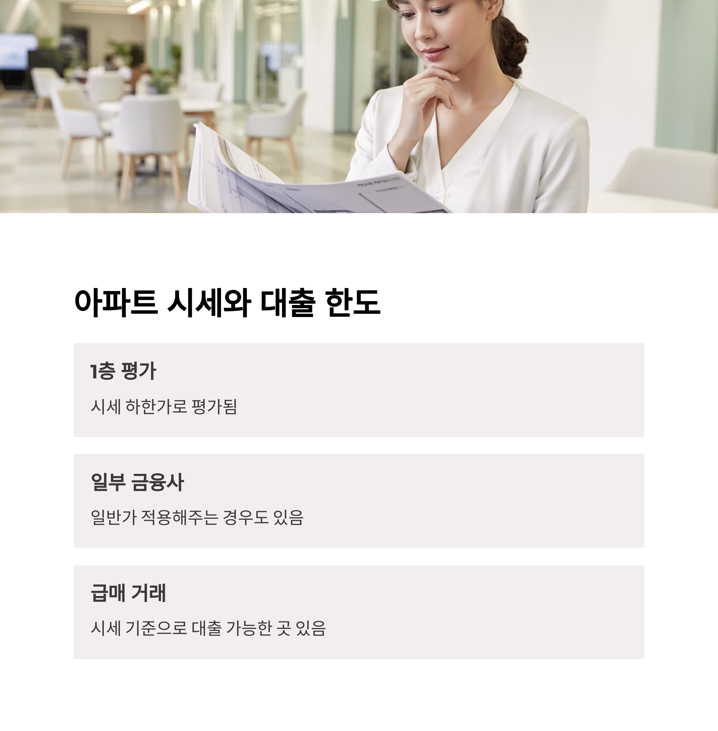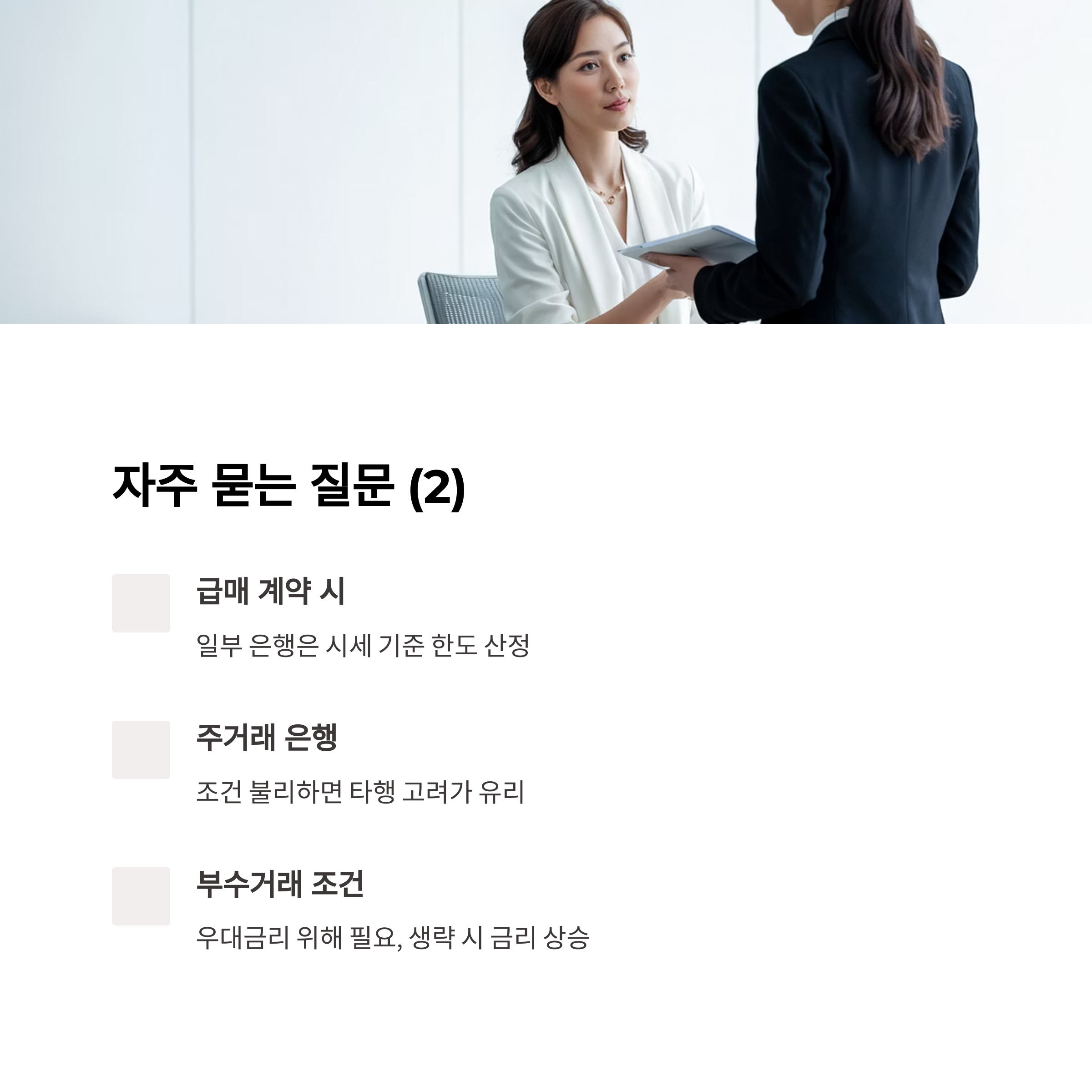 A4. 매매가격보다 시세가 높은 경우, 일부 은행은 시세 기준 한도 산정을 적용하기도 합니다.