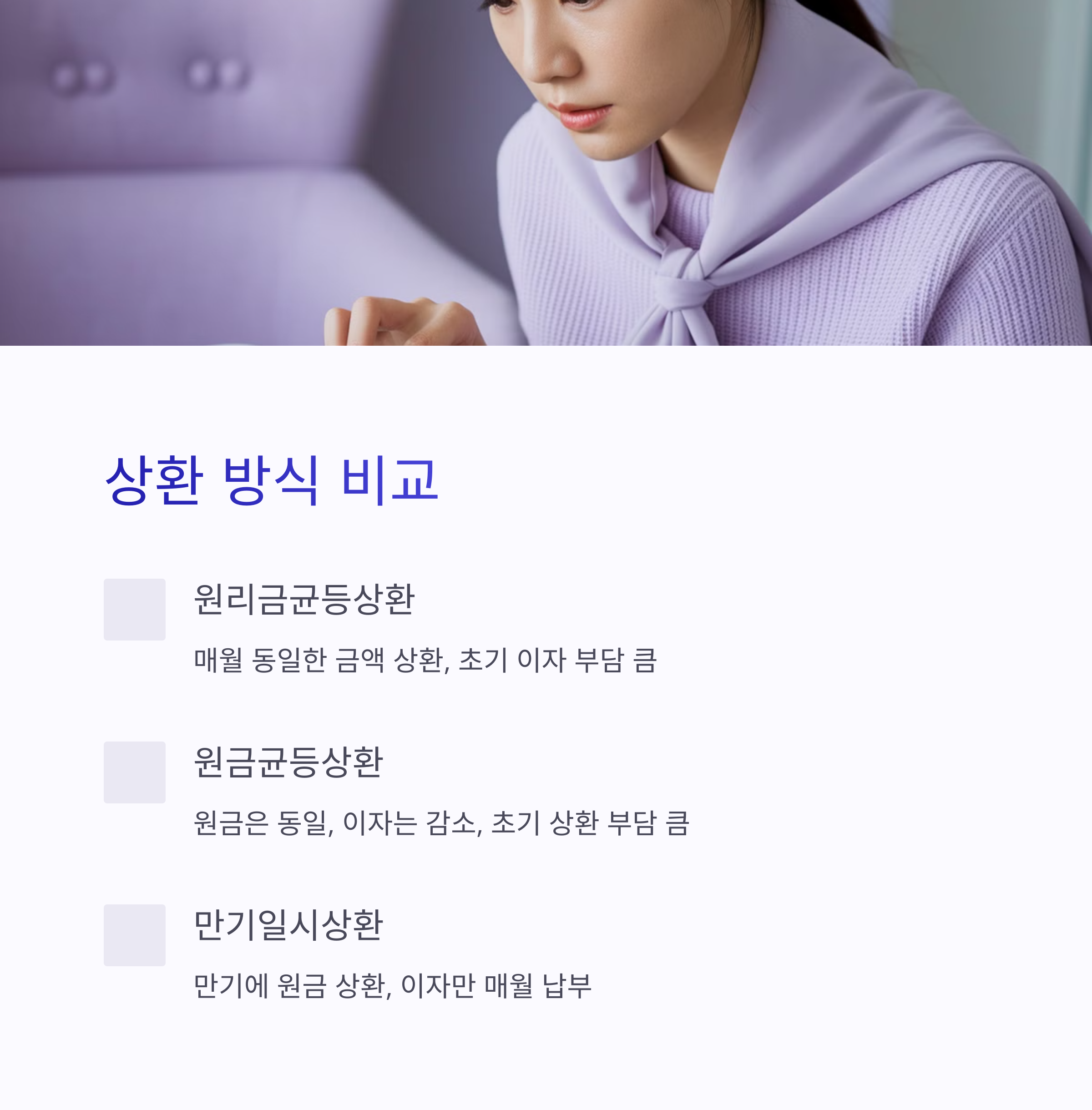 ▶ 상담 시 금리, 중도상환 수수료, 대출 한도 등을 꼼꼼히 확인!