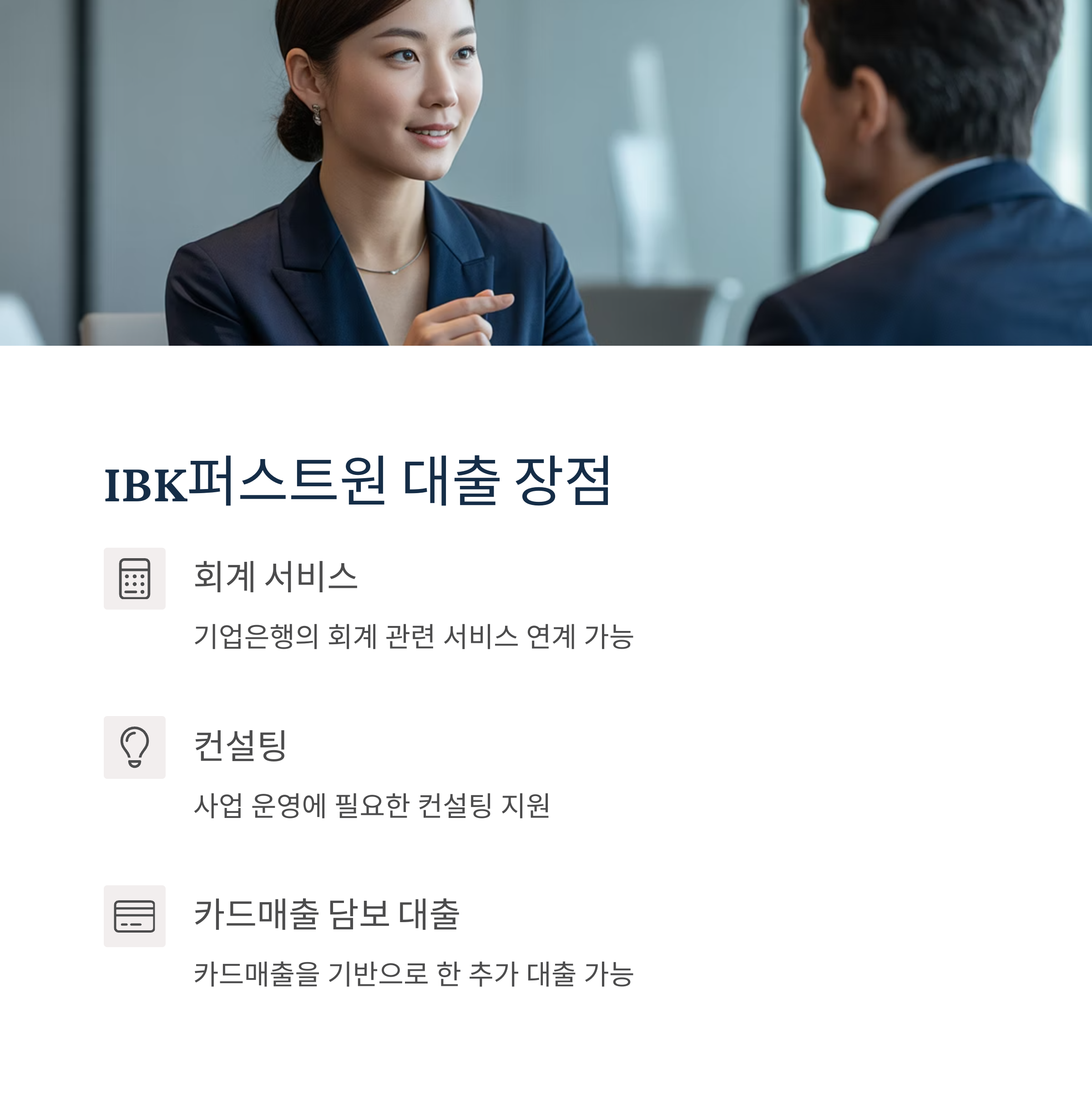 기업은행의 다양한 연계 서비스를 통해 회계, 컨설팅, 카드매출 담보 대출 등과 연계 가능하다는 점도 강점입니다.