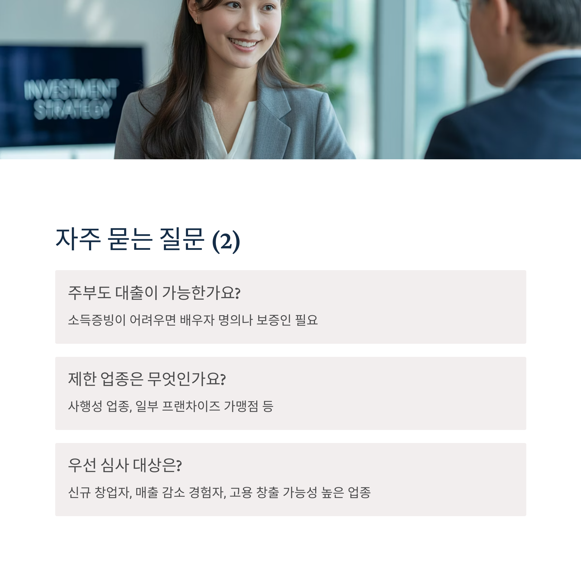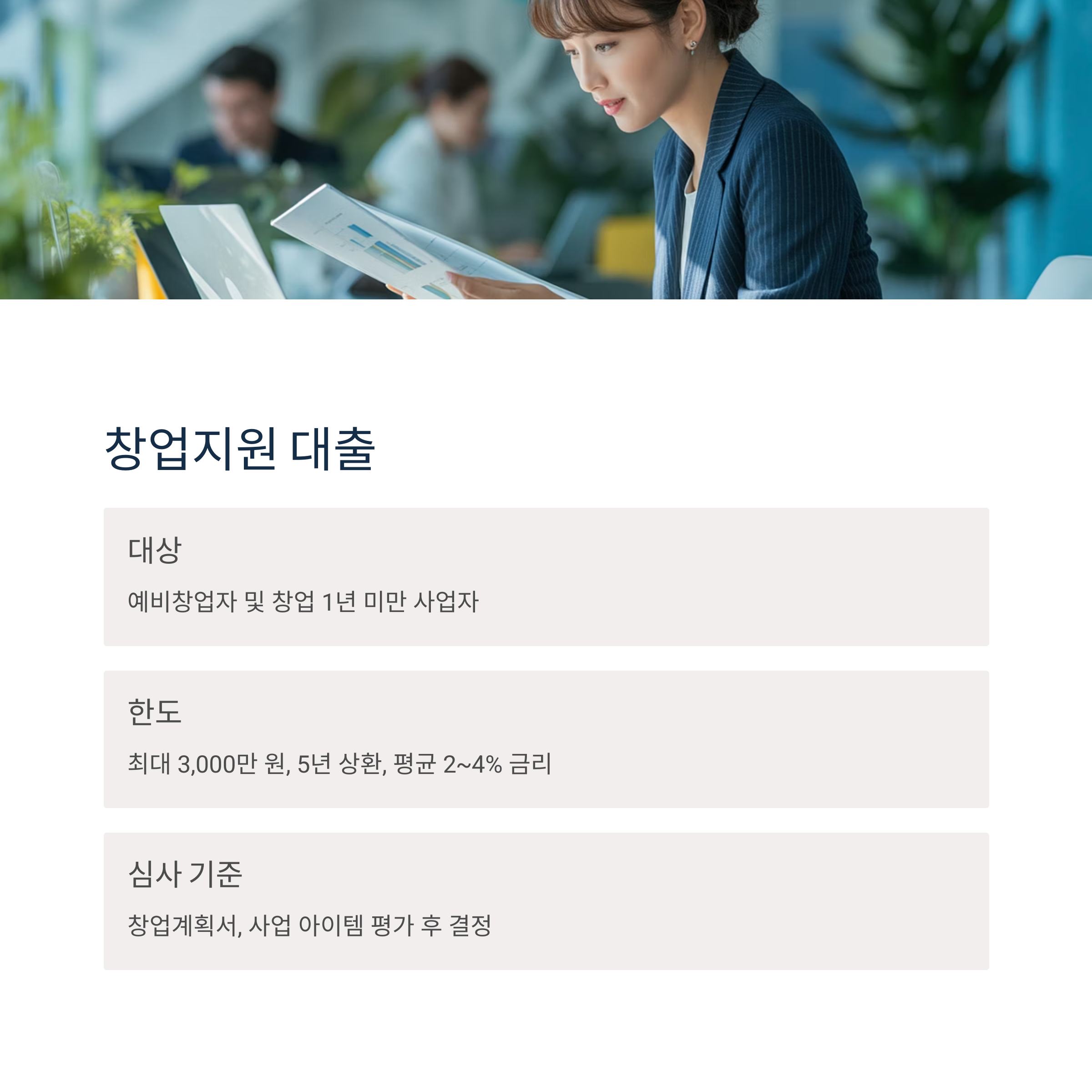 창업 아이템은 있지만 자금이 부족한 경우 유용한 대출입니다. 예비창업자 및 창업 1년 미만 사업자가 주요 대상입니다.