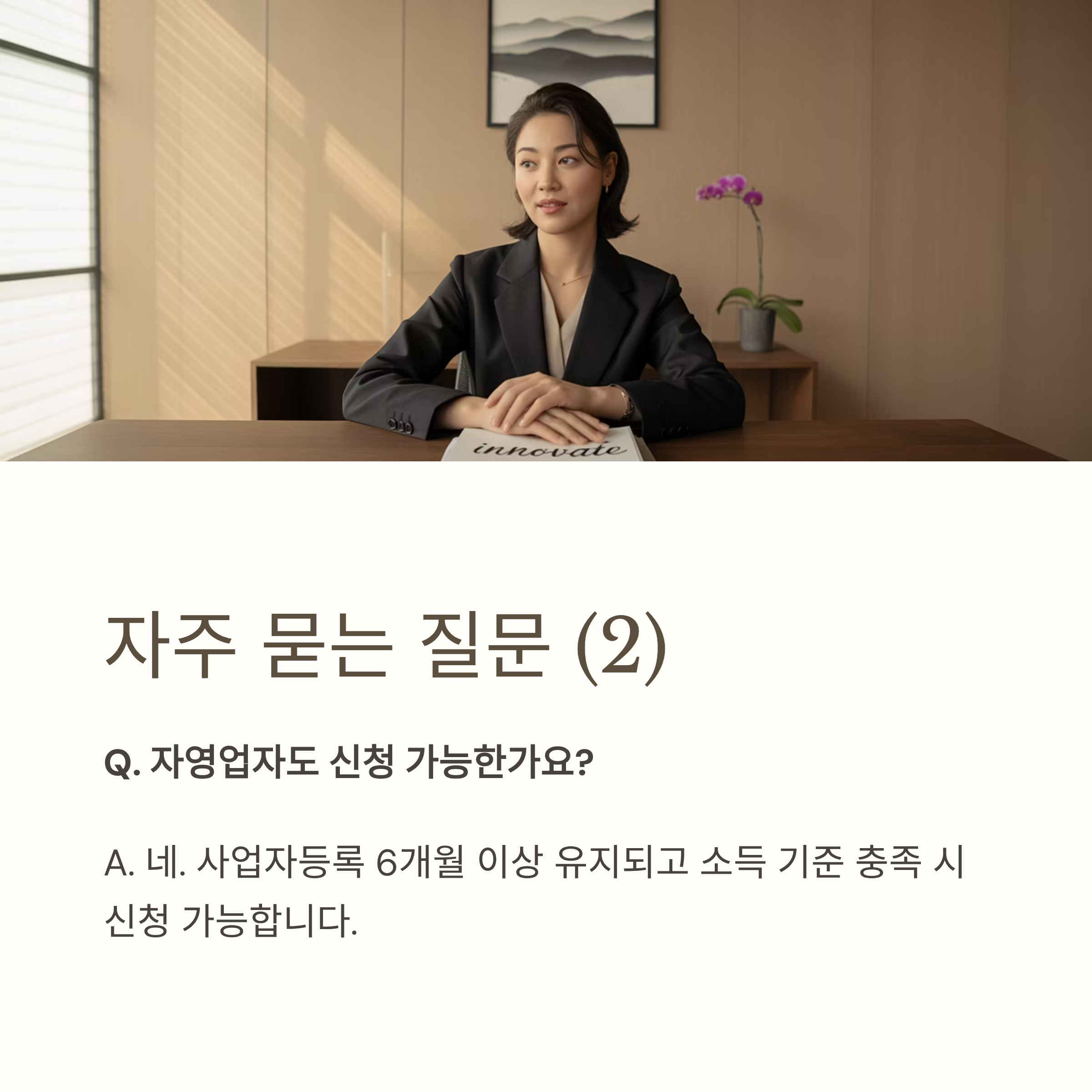 A3. 네. 사업자등록 6개월 이상 유지되고 소득 기준 충족 시 신청 가능합니다.
