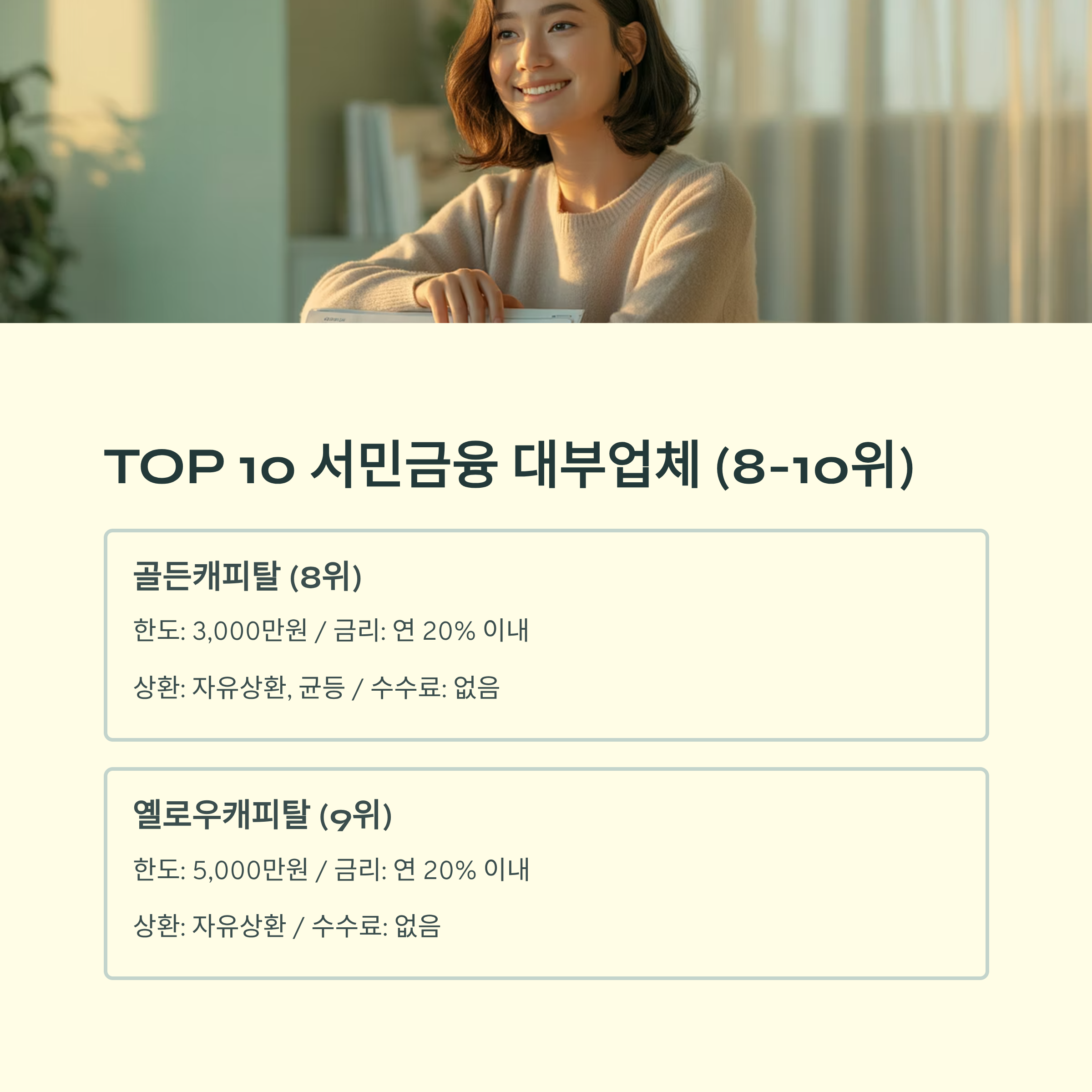 | 8 | 골든캐피탈 | 3,000만원 | 연 20% 이내 | 자유상환, 균등 | 없음 |
