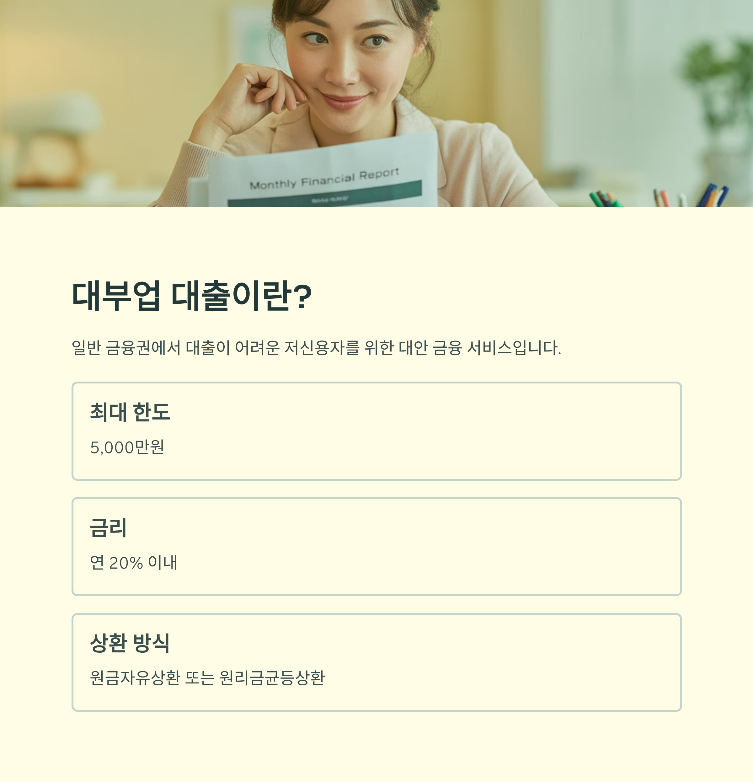 대부업 대출은 일반 금융권에서 대출이 어려운 저신용자에게 자금을 제공하는 대안적 금융 서비스입니다.