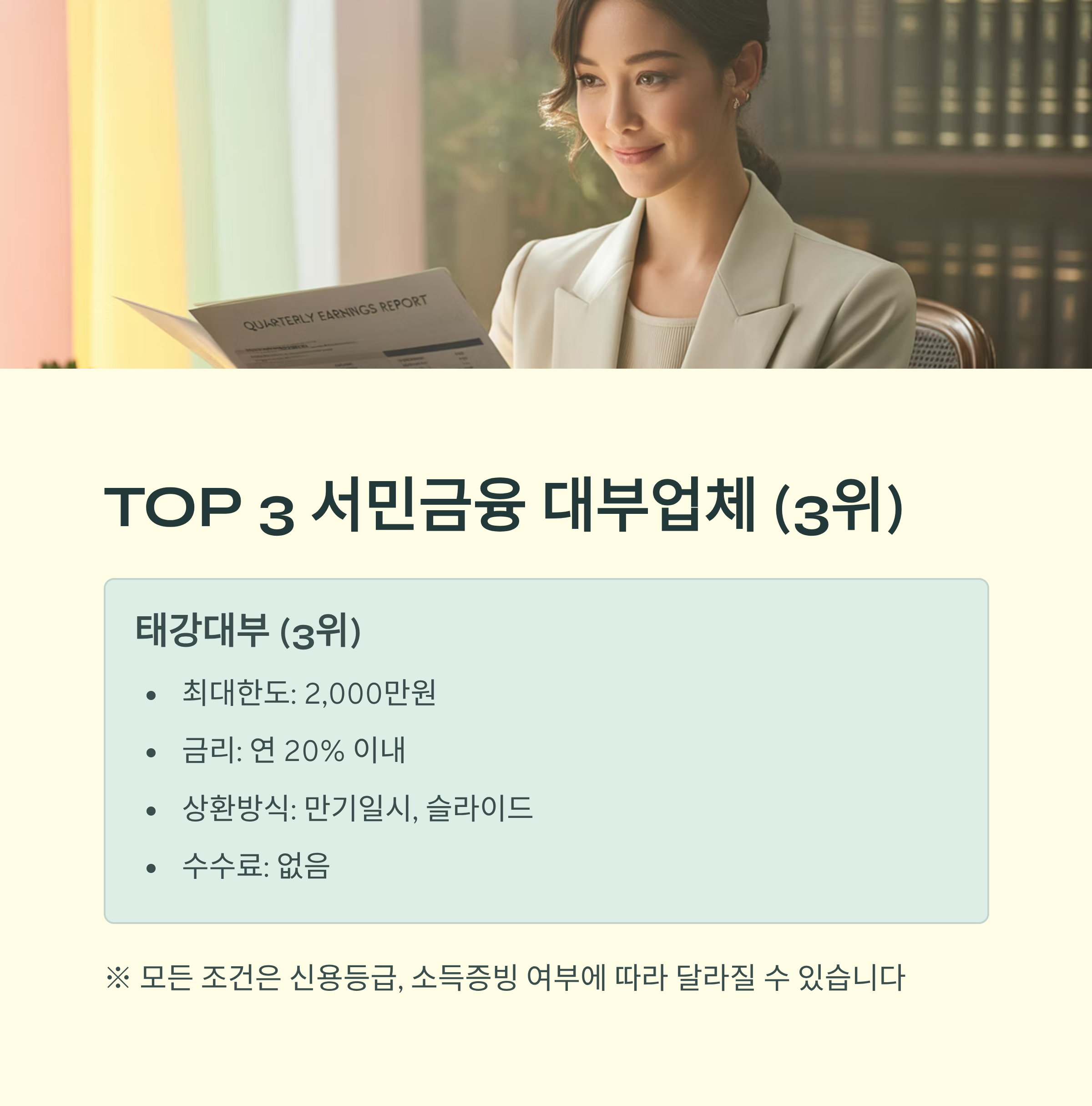 | 3 | 태강대부 | 2,000만원 | 연 20% 이내 | 만기일시, 슬라이드 | 없음 |