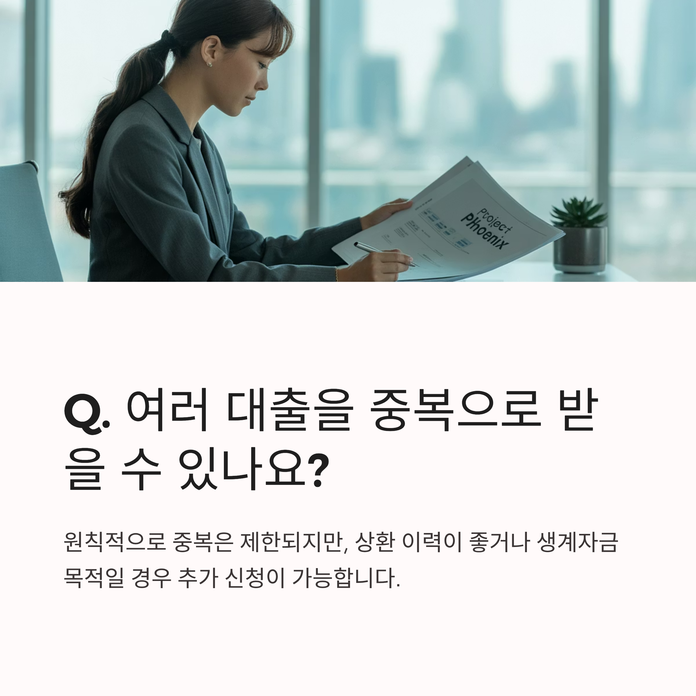 A4. 원칙적으로 중복은 제한되지만, 상환 이력이 좋거나 생계자금 목적일 경우 추가 신청이 가능합니다.