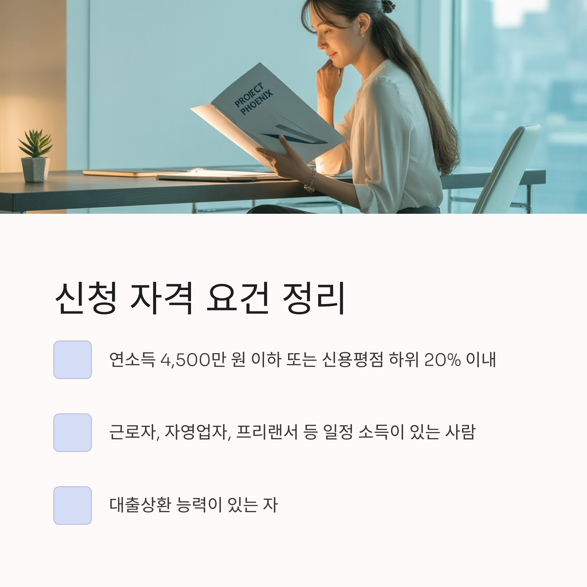 ✔ 연소득 4,500만 원 이하 (또는 신용평점 하위 20% 이내)