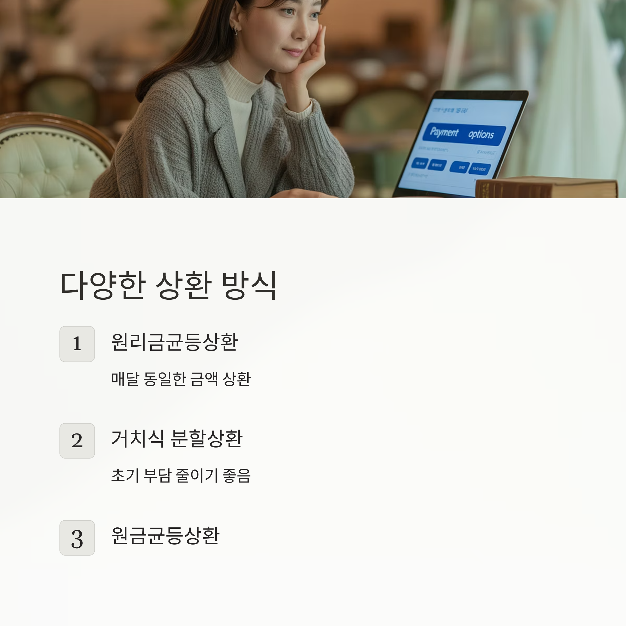 A4. 원리금균등상환, 거치식 분할상환, 원금균등상환 등 다양한 선택이 가능합니다.