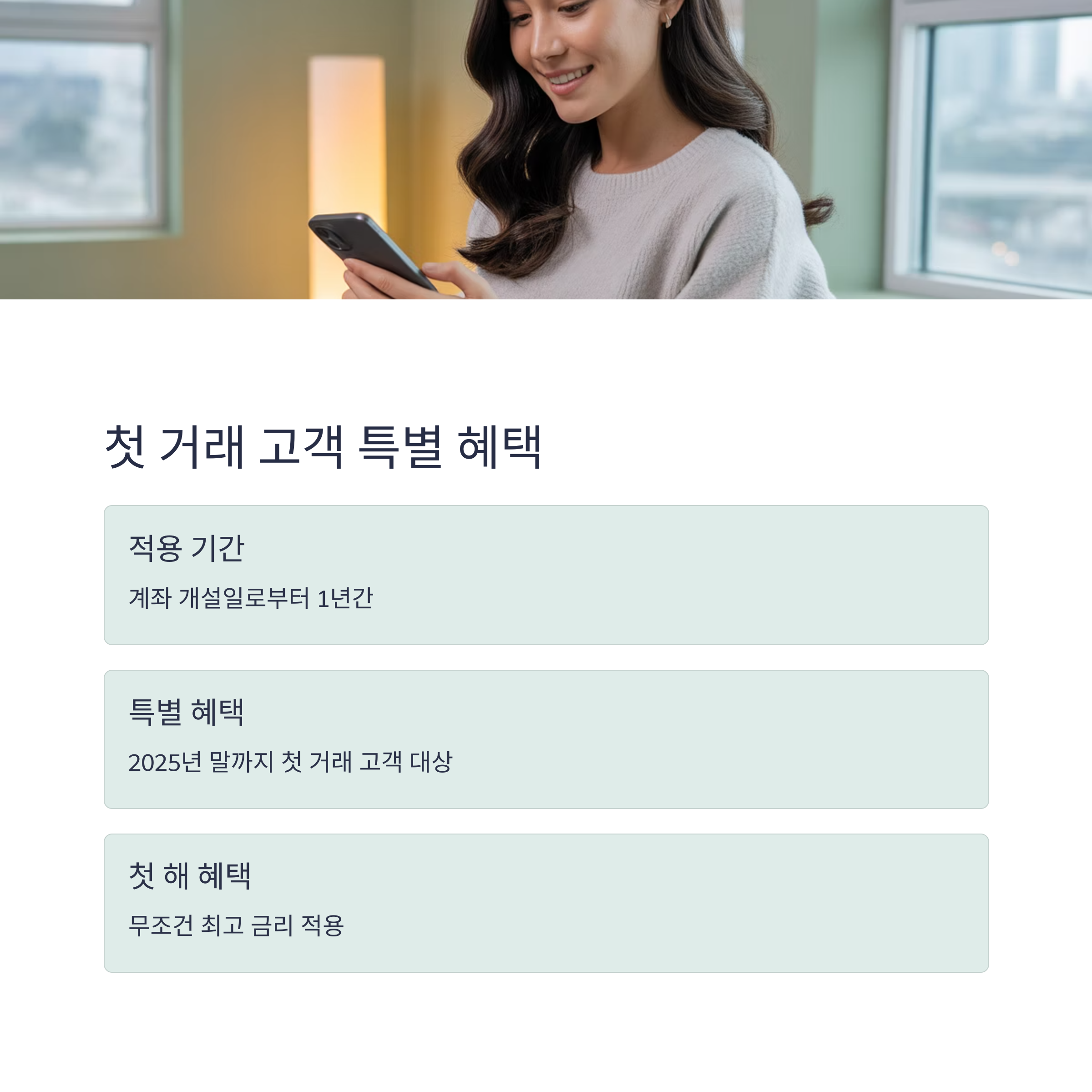 💡 2025년 말까지 첫 거래 고객에게는 다음과 같은 특별 금리 혜택이 적용됩니다.