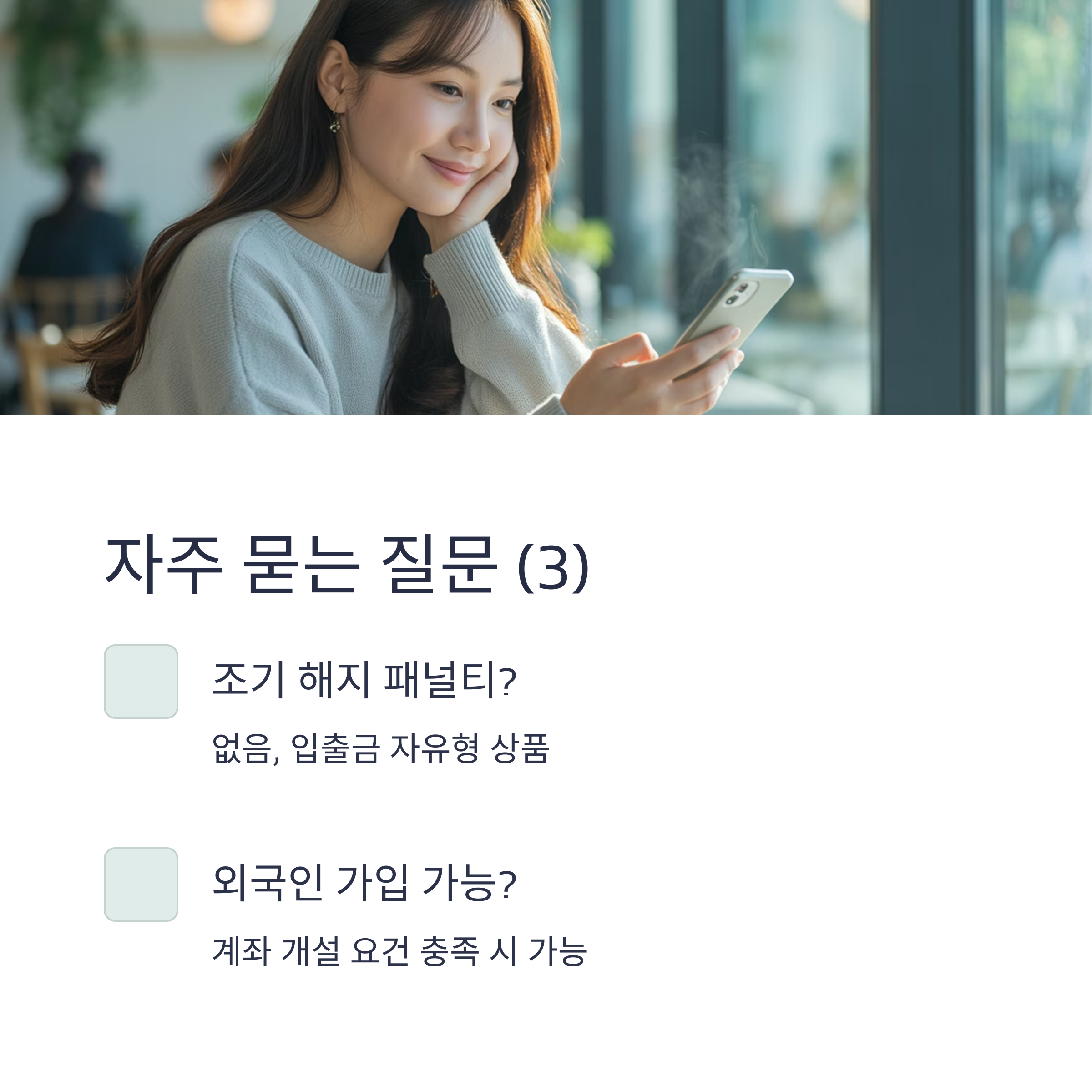 A7. 전혀 없습니다. 입출금 자유형 상품이므로 해지에 따른 불이익은 없습니다.