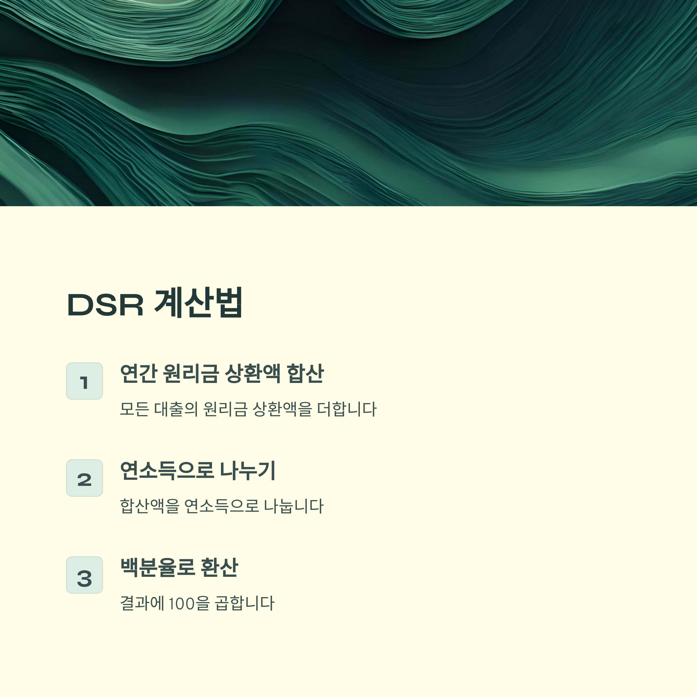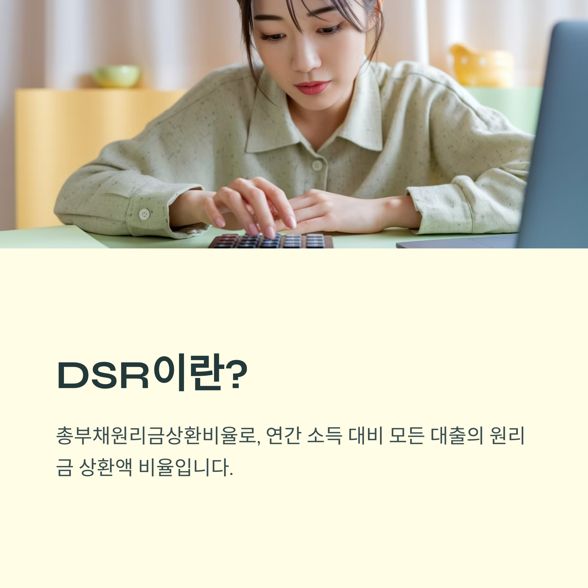 DSR(Debt Service Ratio)은 연소득 대비 모든 대출의 연간 원리금 상환액 비율을 의미합니다. DSR 기준이 높을수록 대출 한도가 줄어듭니다.