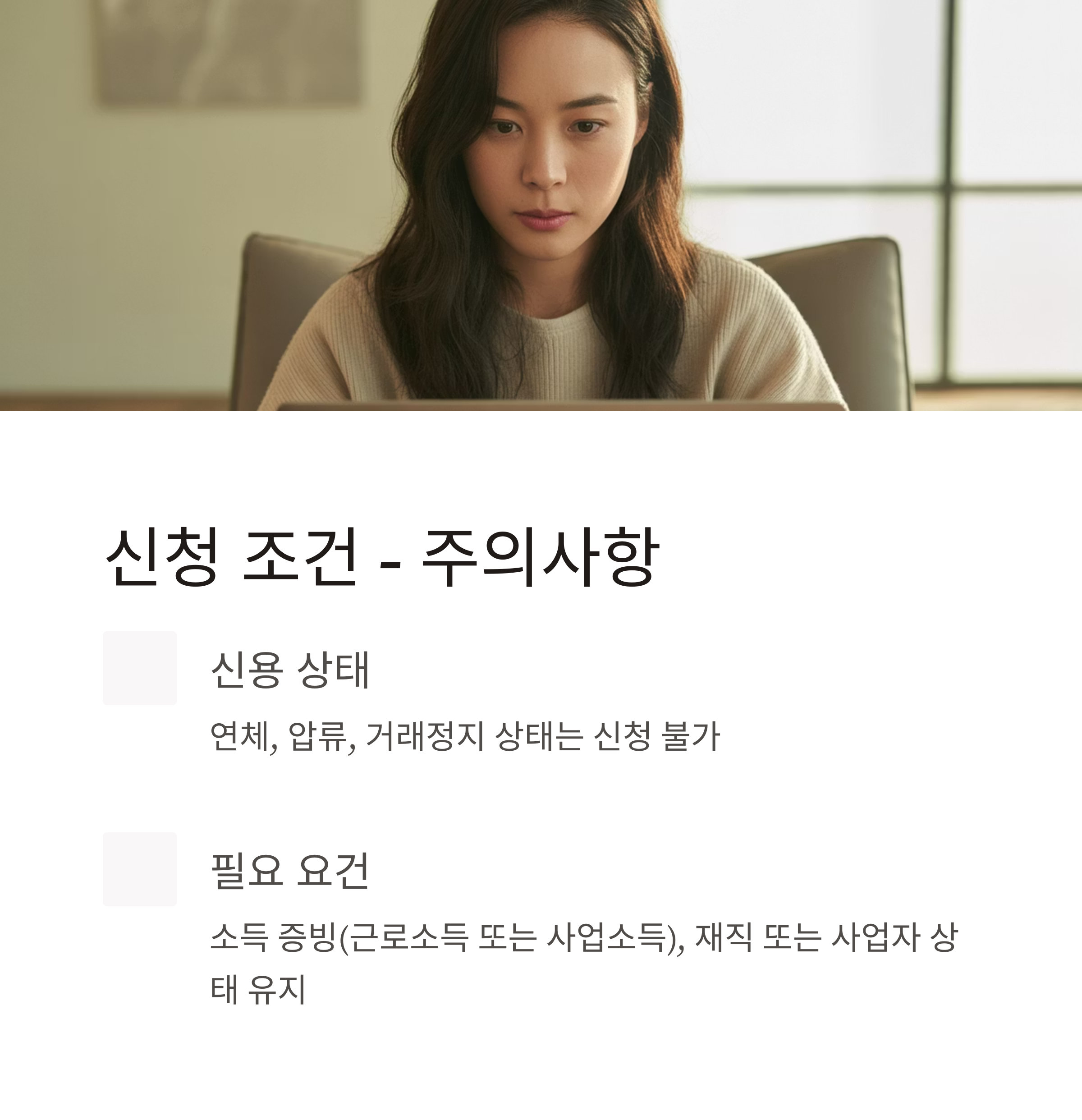 - 신용 상태: 연체, 압류, 거래정지 상태는 신청 불가