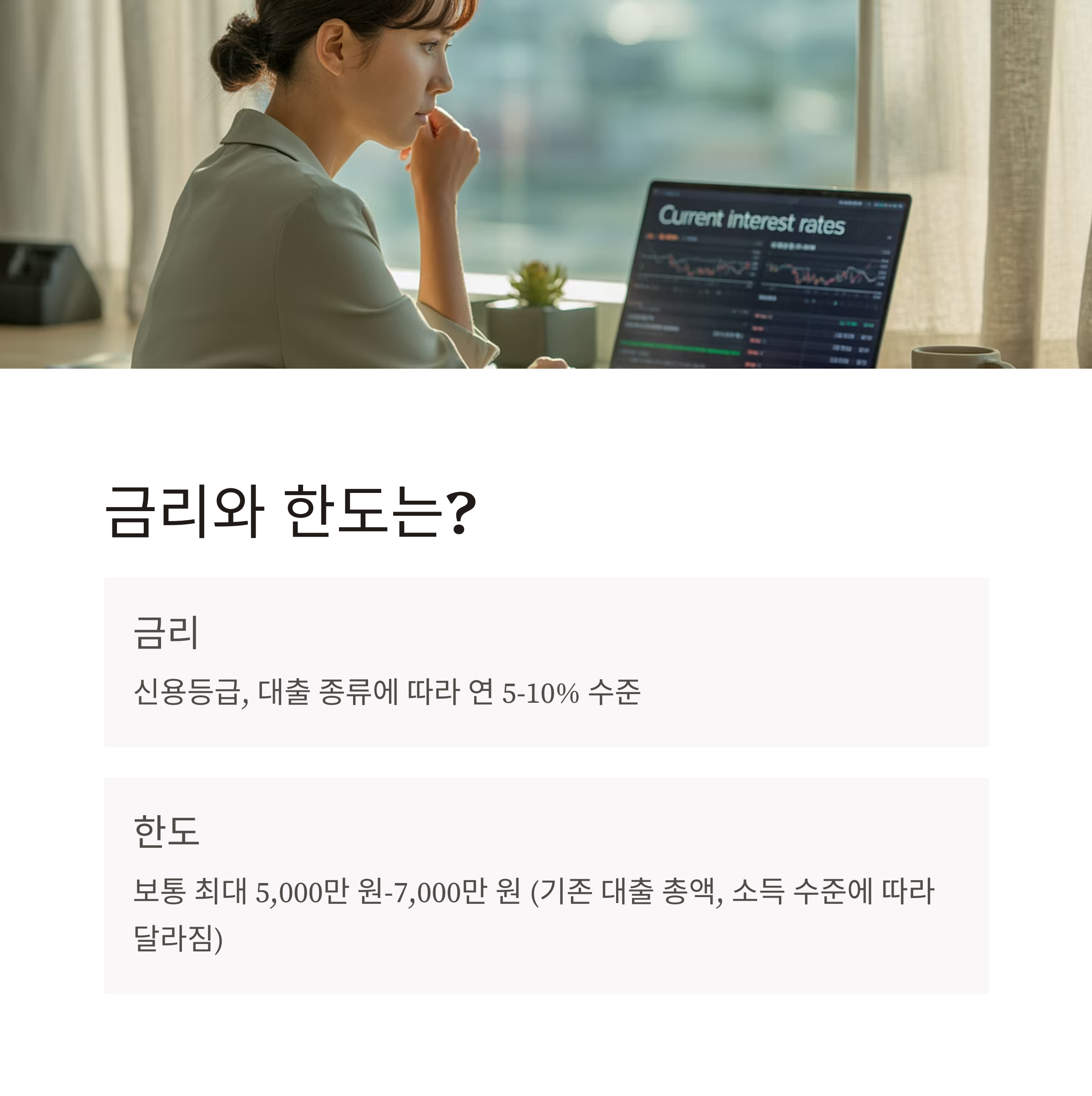 - 금리: 신용등급, 대출 종류에 따라 연 5~10% 수준
