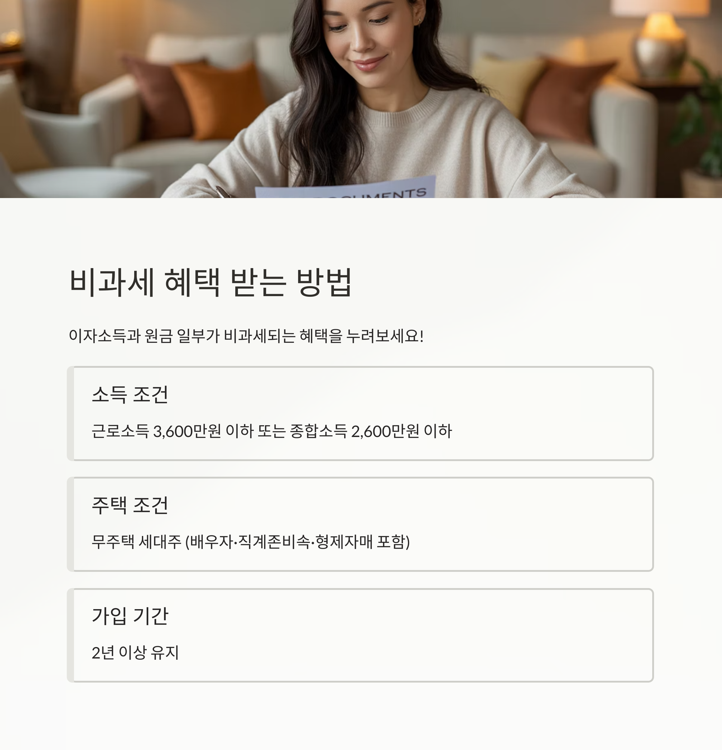 아래 조건을 모두 만족할 경우 이자소득과 원금 일부가 비과세됩니다.