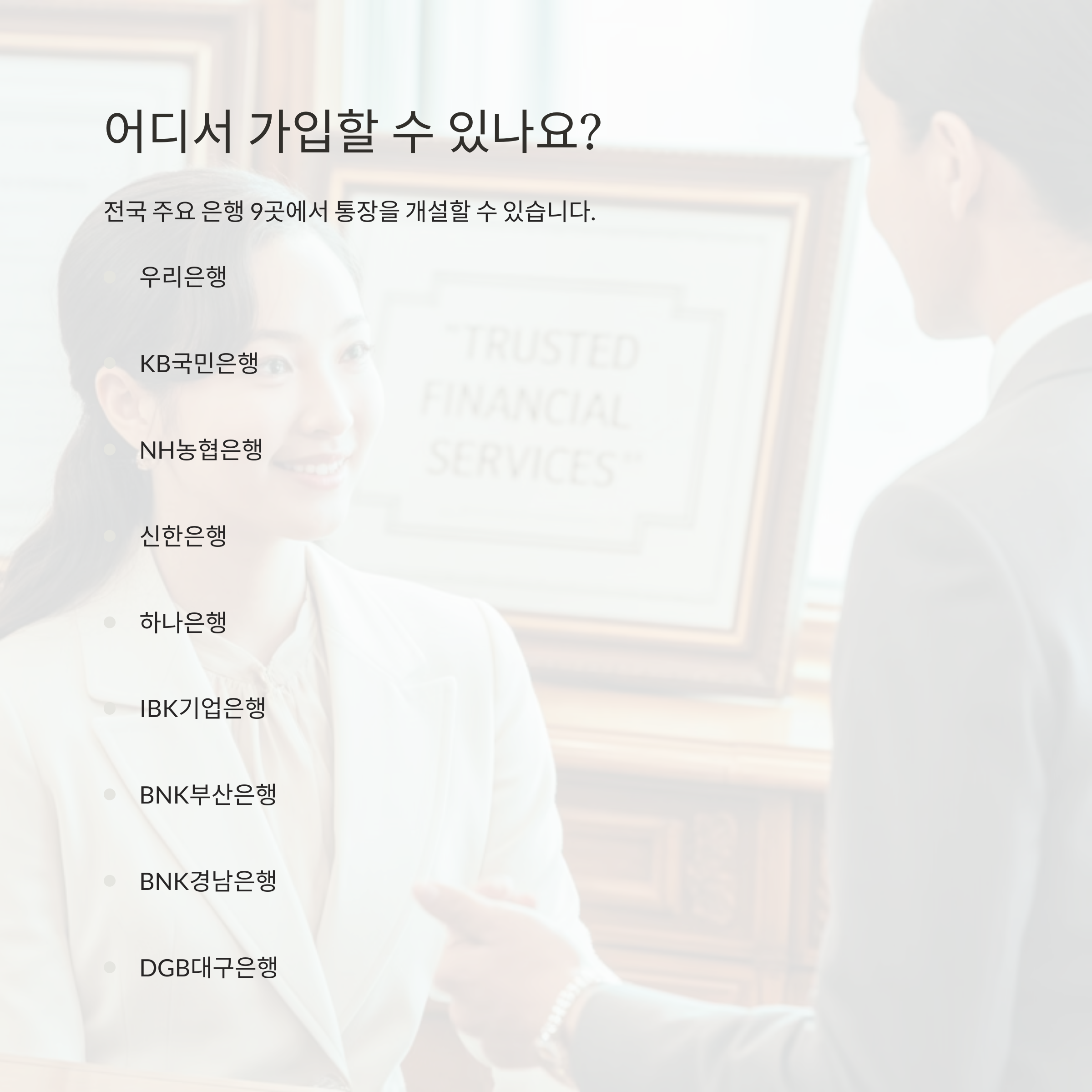 전국 주요 은행 9곳에서 통장을 개설할 수 있습니다.