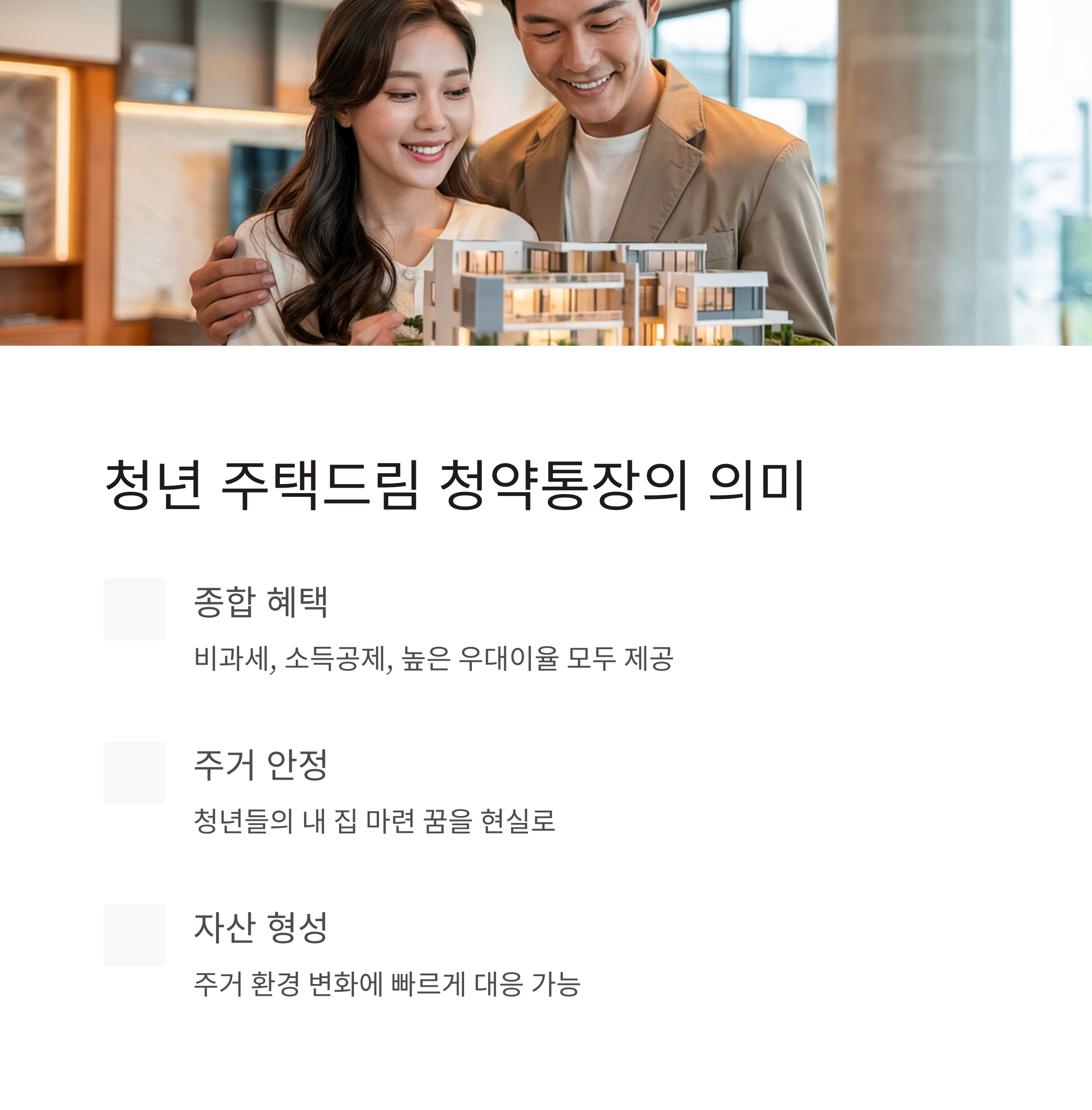 청년 주택드림 청약통장은 단순한 청약 통장이 아닙니다. 비과세, 소득공제, 높은 우대이율까지 청년들에게 꼭 필요한 혜택이 모두 담겨 있습니다. 주거 안정을 꿈꾸는 청년이라면 지금 바로 가입하거나 전환을 고려해보세요. 앞으로 주거 환경 변화에 빠르게 대응하는 것이 청년들의 자산 형성에 큰 도움이 될 것입니다.