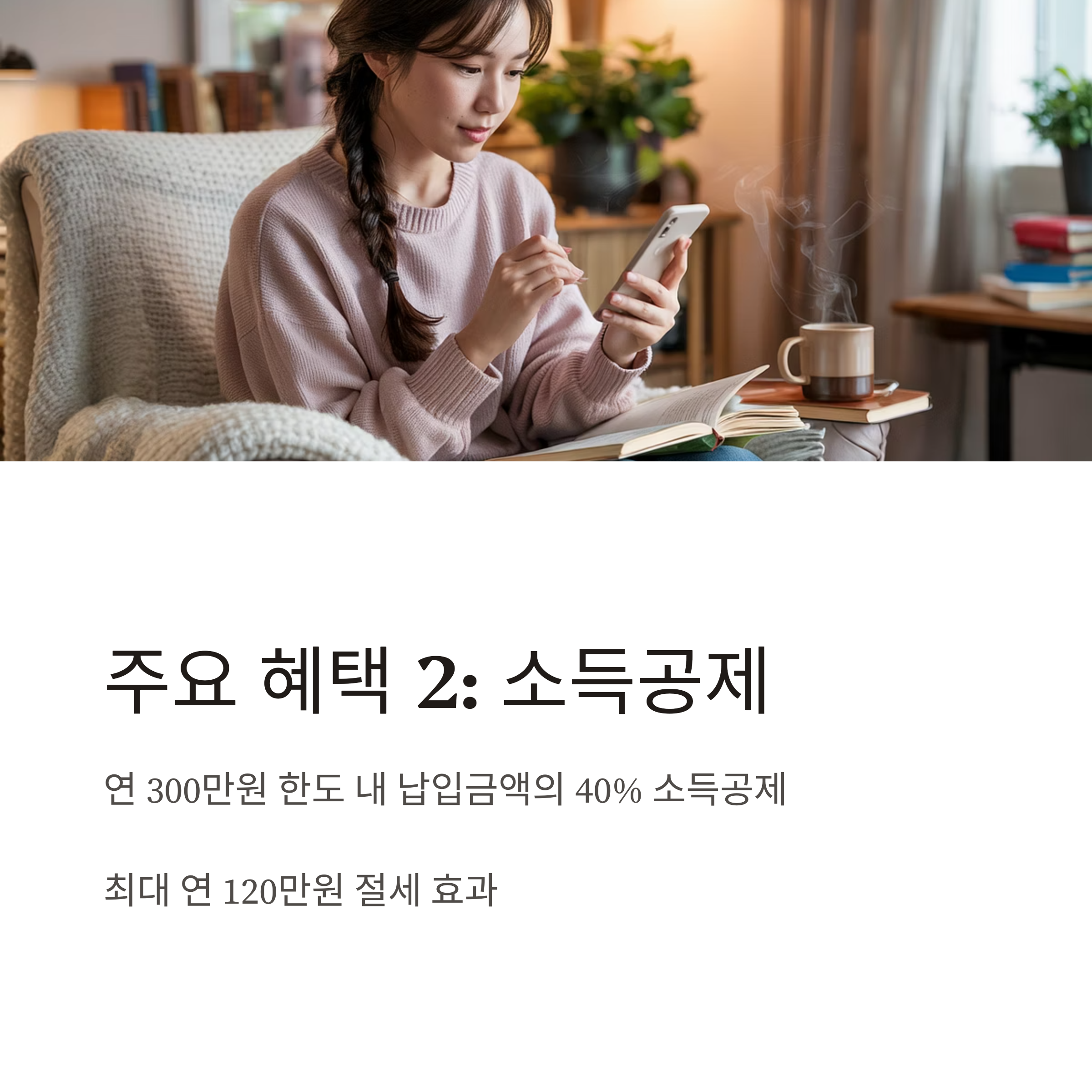 ✔ 소득공제: 연 300만원 한도 내 납입금액의 40% 소득공제 (최대 연 120만원)