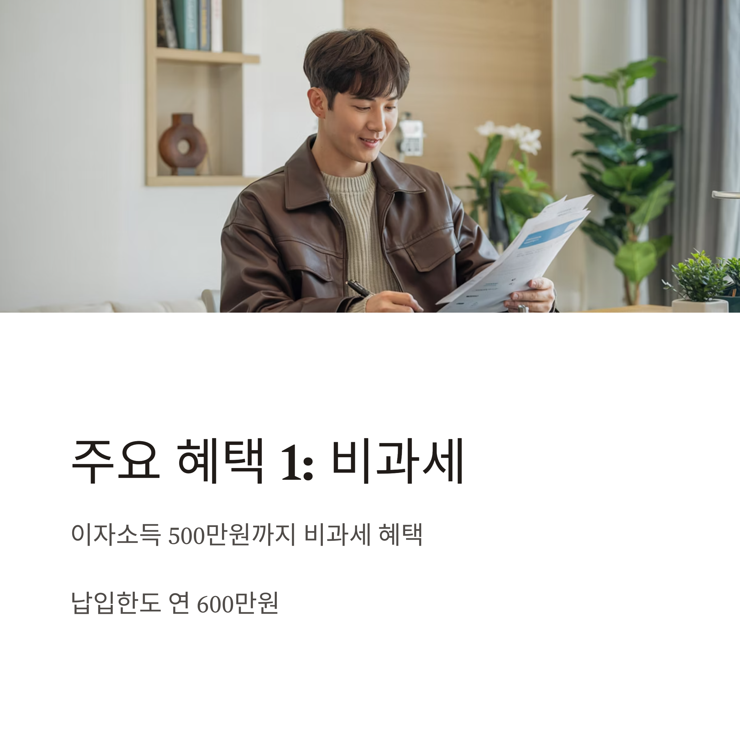 ✔ 비과세 혜택: 이자소득 500만원까지 비과세 (납입한도 연 600만원)