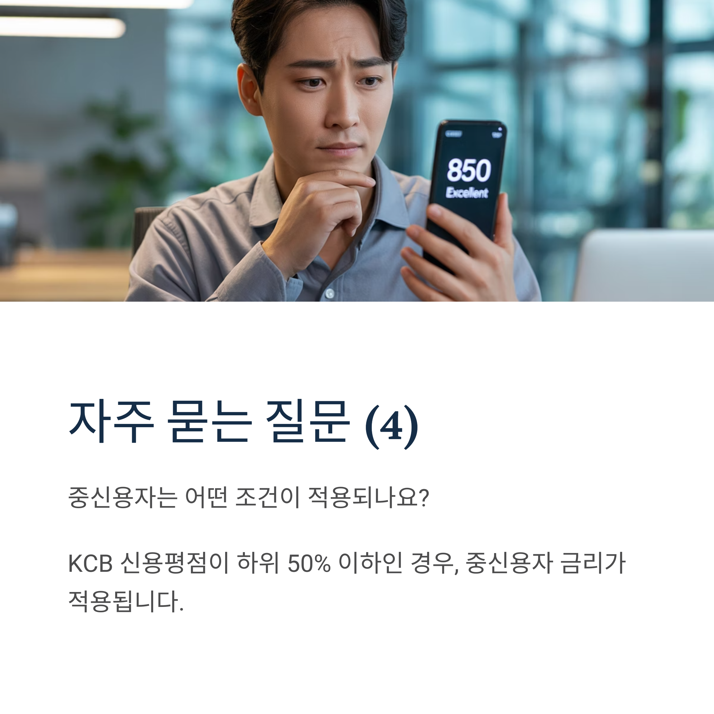 A7. KCB 신용평점이 하위 50% 이하인 경우, 중신용자 금리가 적용되며, 일반보다 금리가 다소 높습니다.