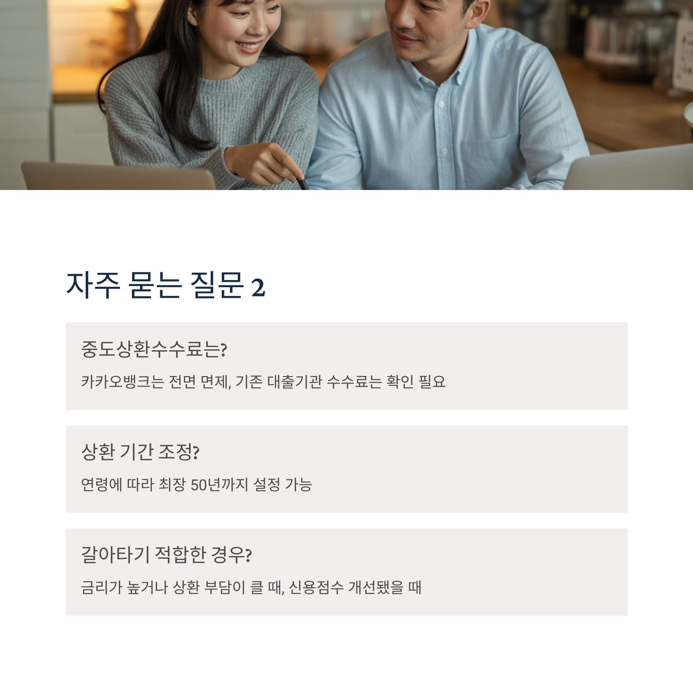 A5. 연령에 따라 최장 50년까지 설정 가능하며, 월 상환액을 유연하게 줄일 수 있습니다.