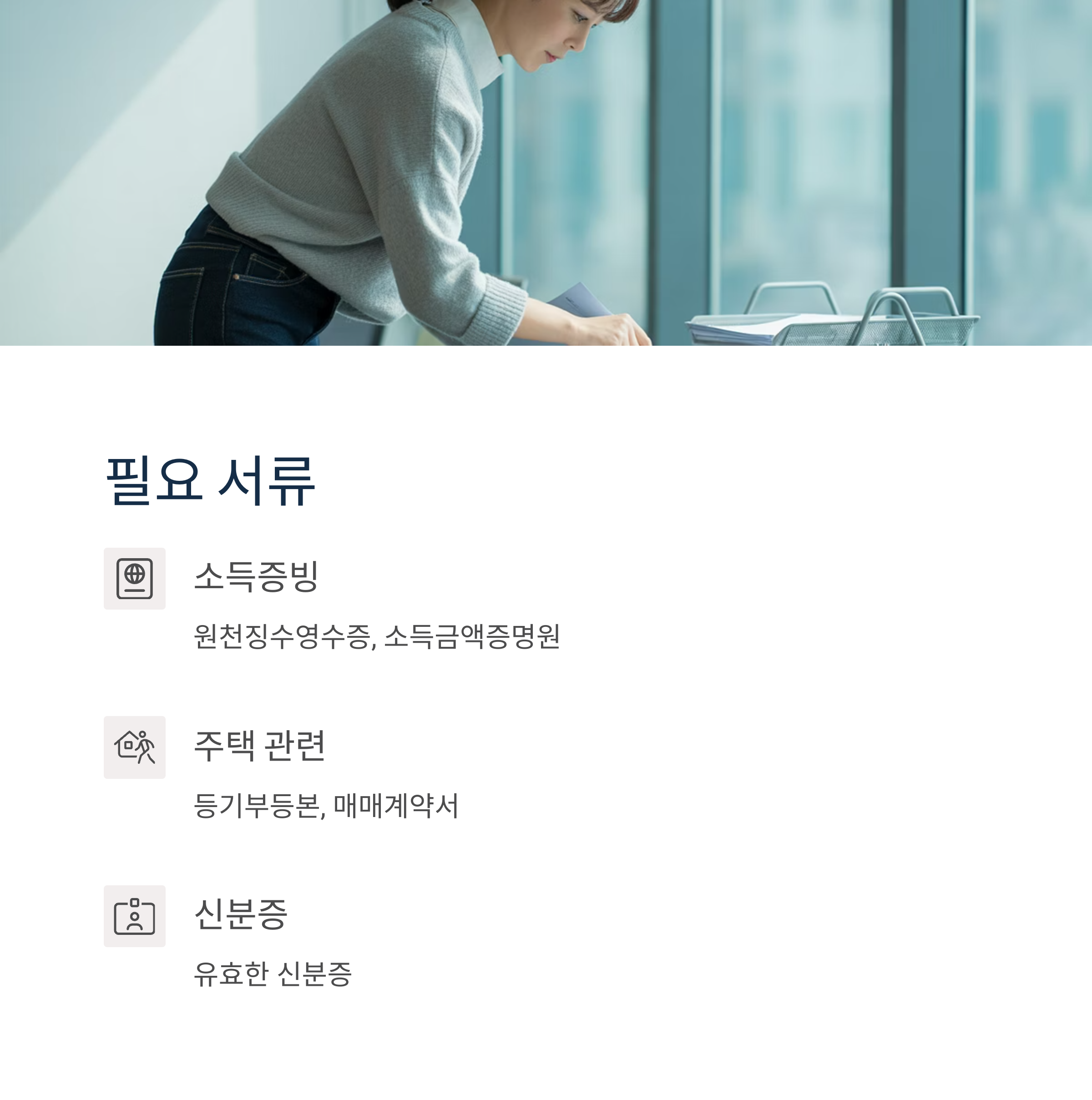 → 필요 서류: 소득증빙, 등기부등본, 신분증 등 - 대출 심사