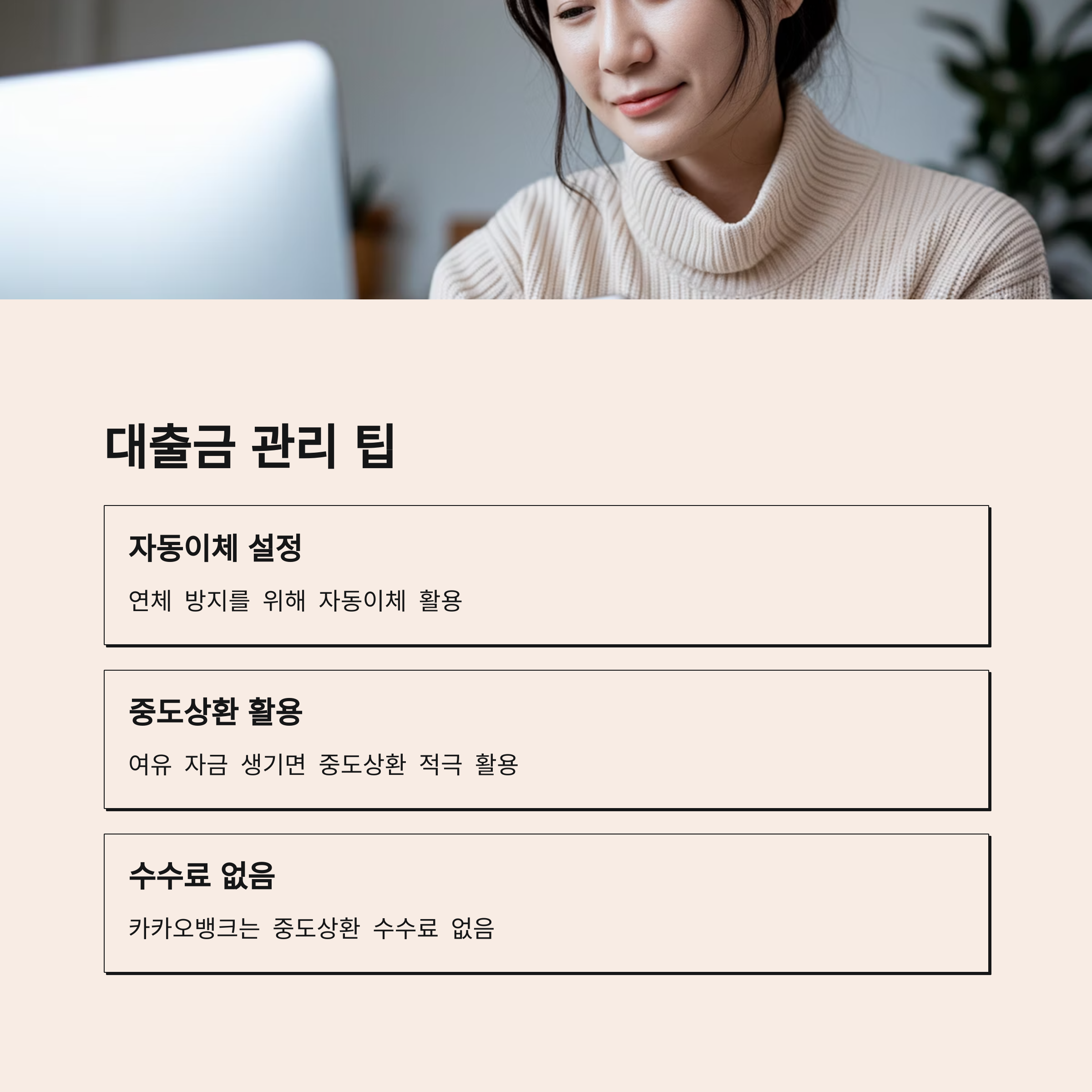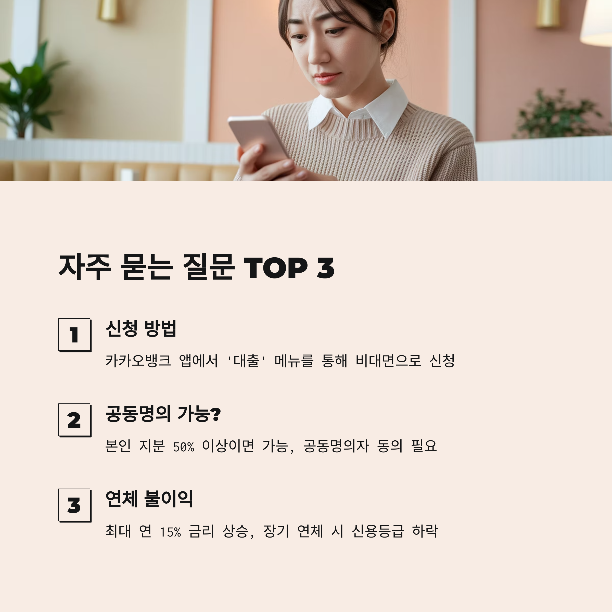 또한, 대출금은 자동이체로 설정하여 연체를 방지하고, 여유 자금이 생기면 중도상환을 적극 활용하세요. 카카오뱅크는 중도상환 수수료가 없어 조기상환 시 부담이 없습니다.
