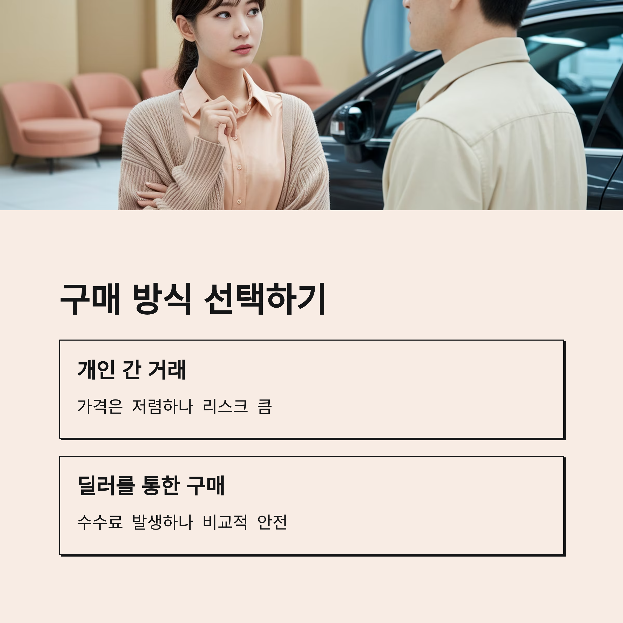 - 딜러를 통한 구매: 수수료 발생하나 비교적 안전