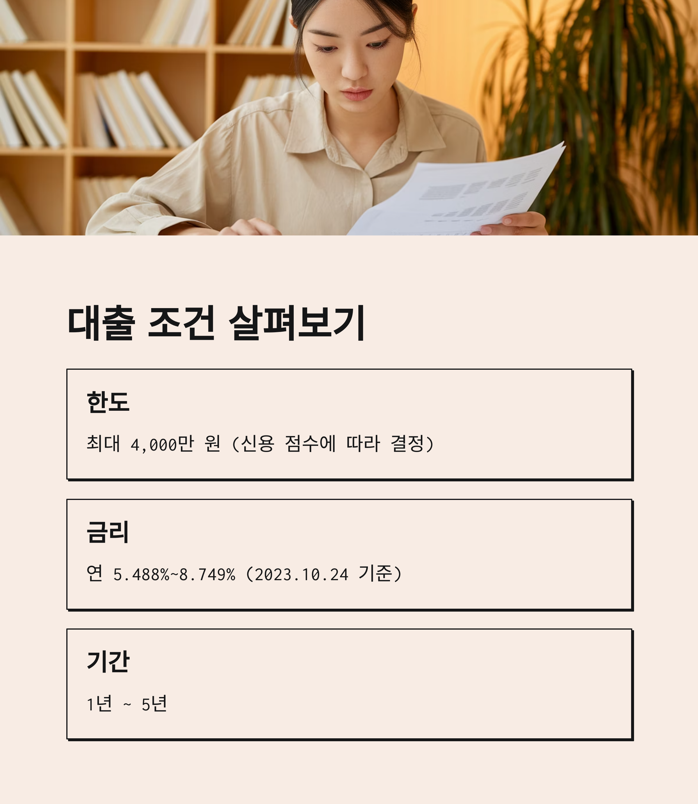 - 한도: 최대 4,000만 원 (신용 점수에 따라 결정)