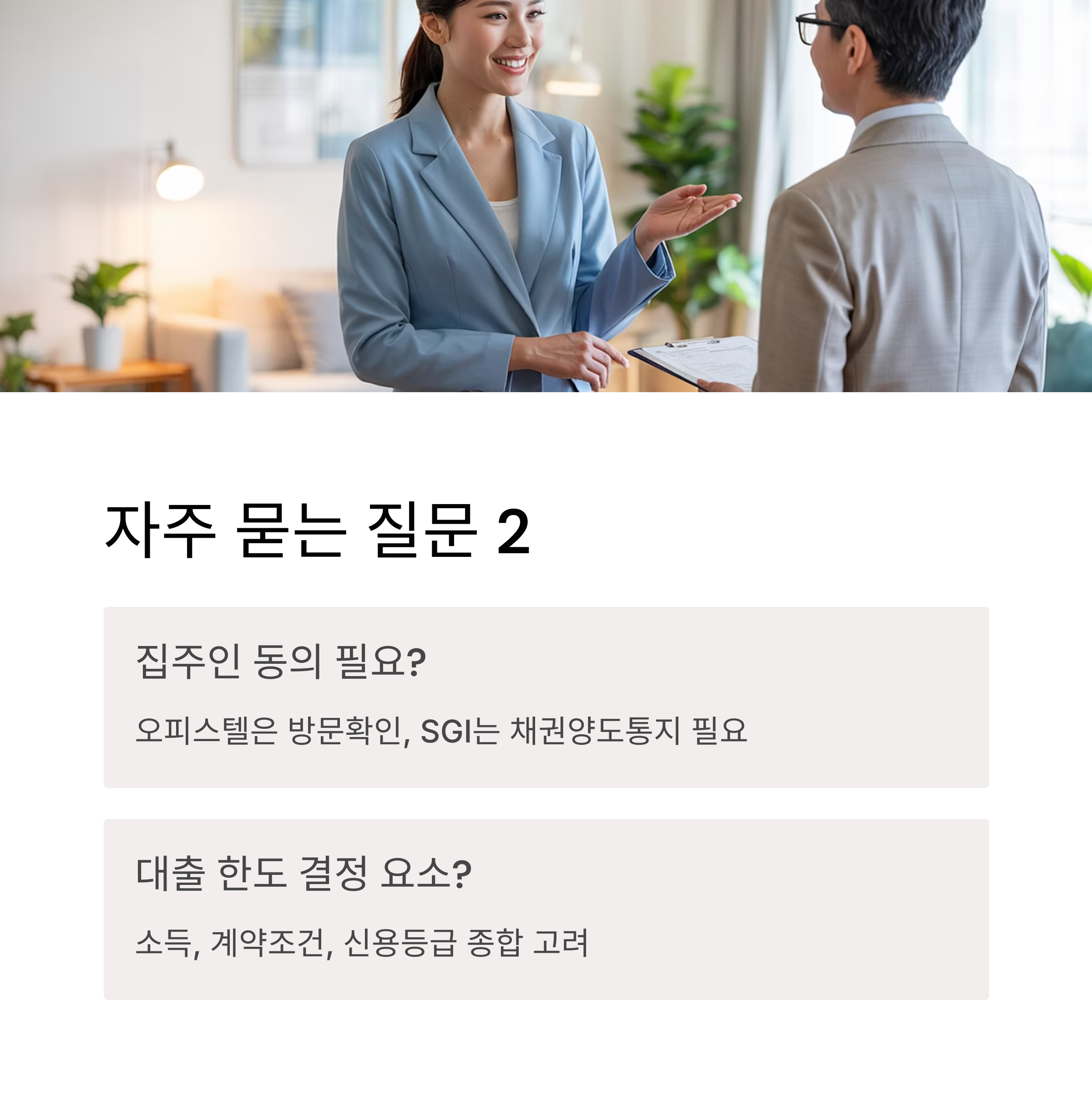 A3. 네, 필요할 수 있습니다. 특히 오피스텔은 권리조사기관의 집주인 방문확인이 필수이며, SGI 대출은 채권양도통지가 필요합니다.