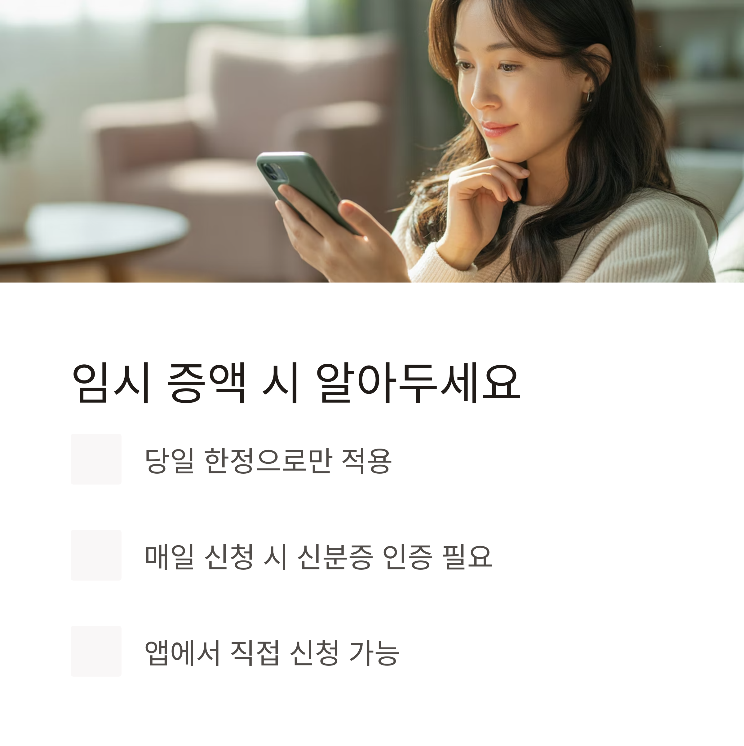 한도 상향이 일시적으로 필요한 경우, 하루 단위로 임시 증액을 신청할 수 있습니다.