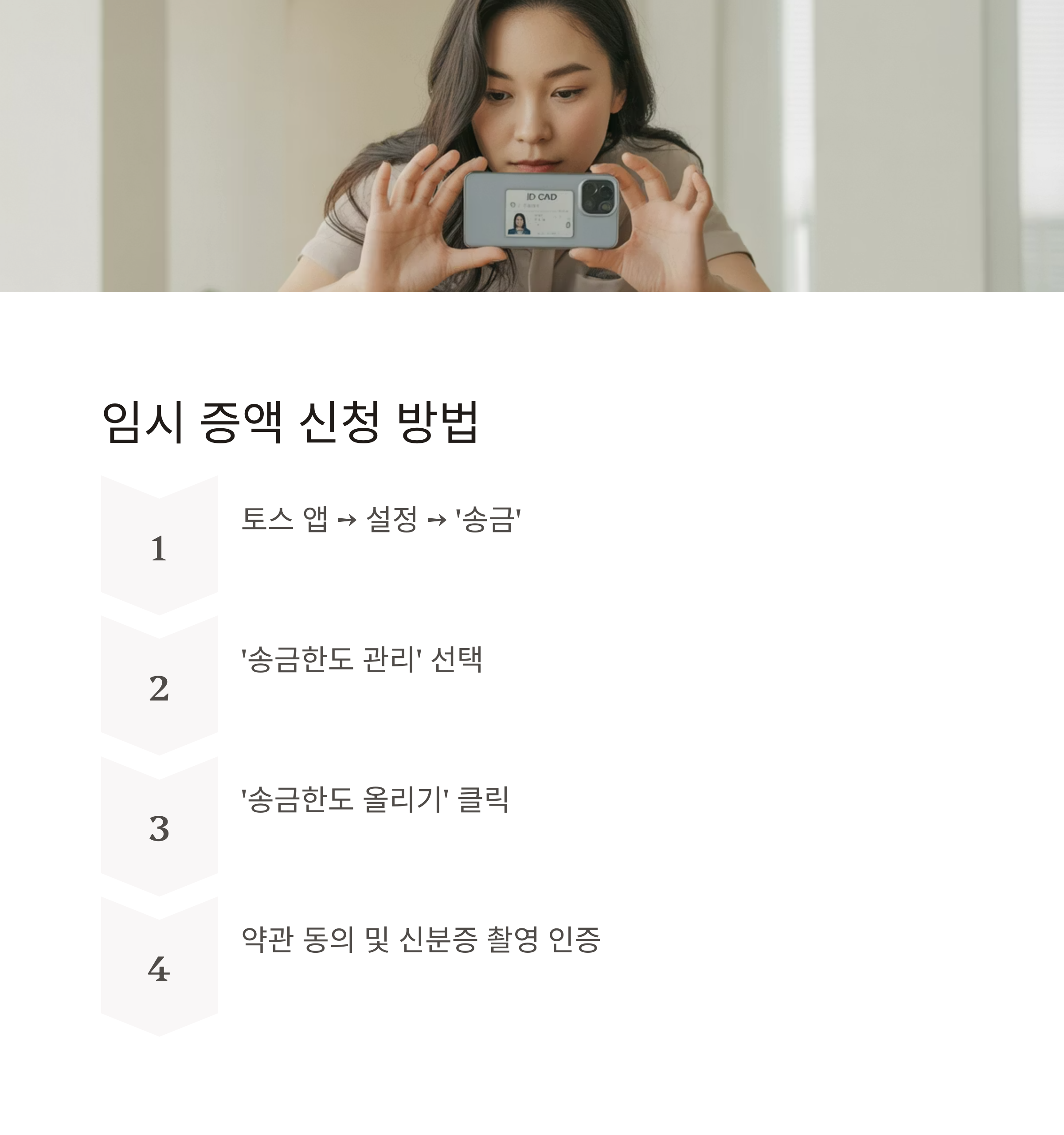A4. 토스 앱에서 ‘송금한도 관리’에 들어가서 ‘송금한도 올리기’를 선택 후 신분증 인증을 통해 진행합니다.