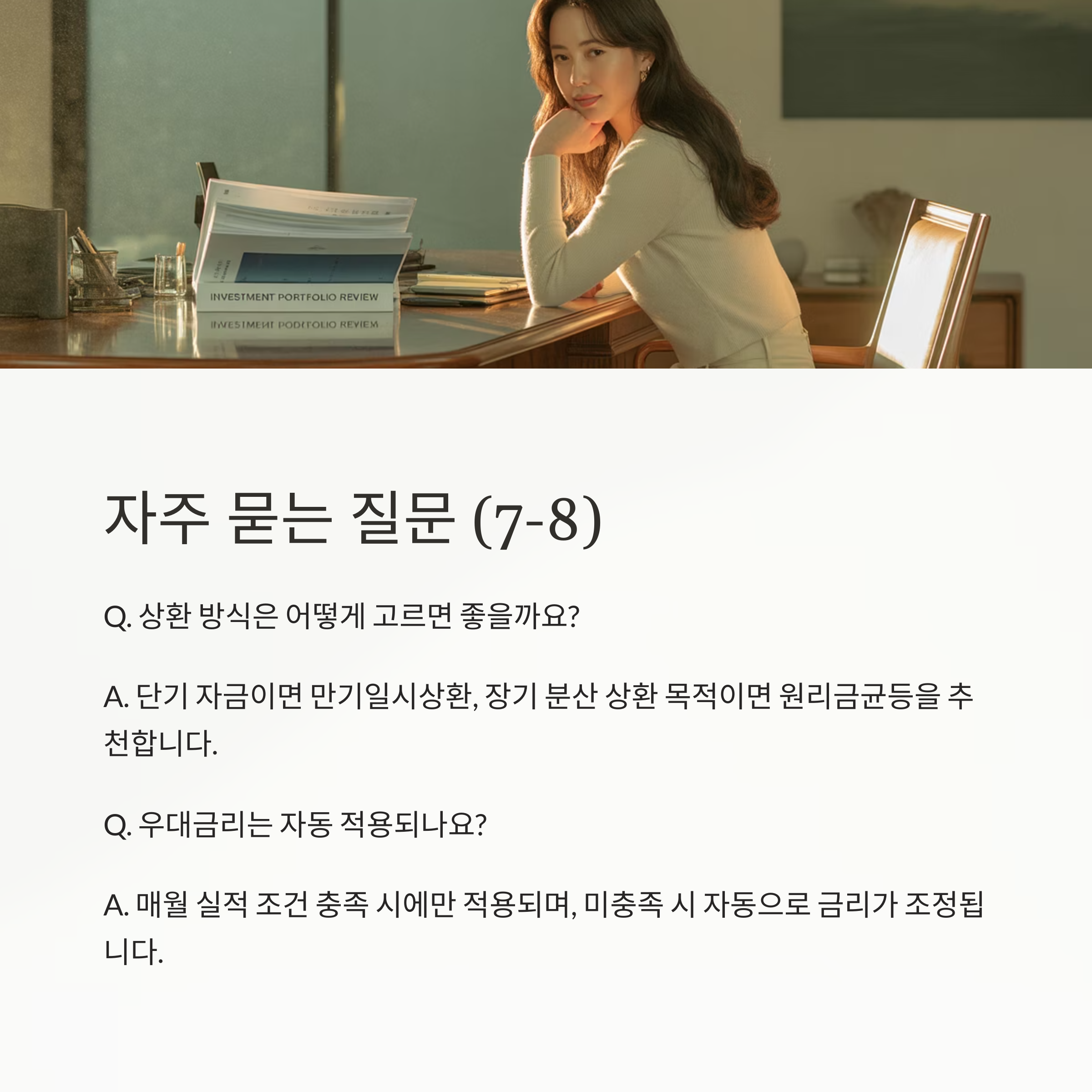 A7. 단기 자금이면 만기일시상환, 장기 분산 상환 목적이면 원리금균등을 추천합니다.