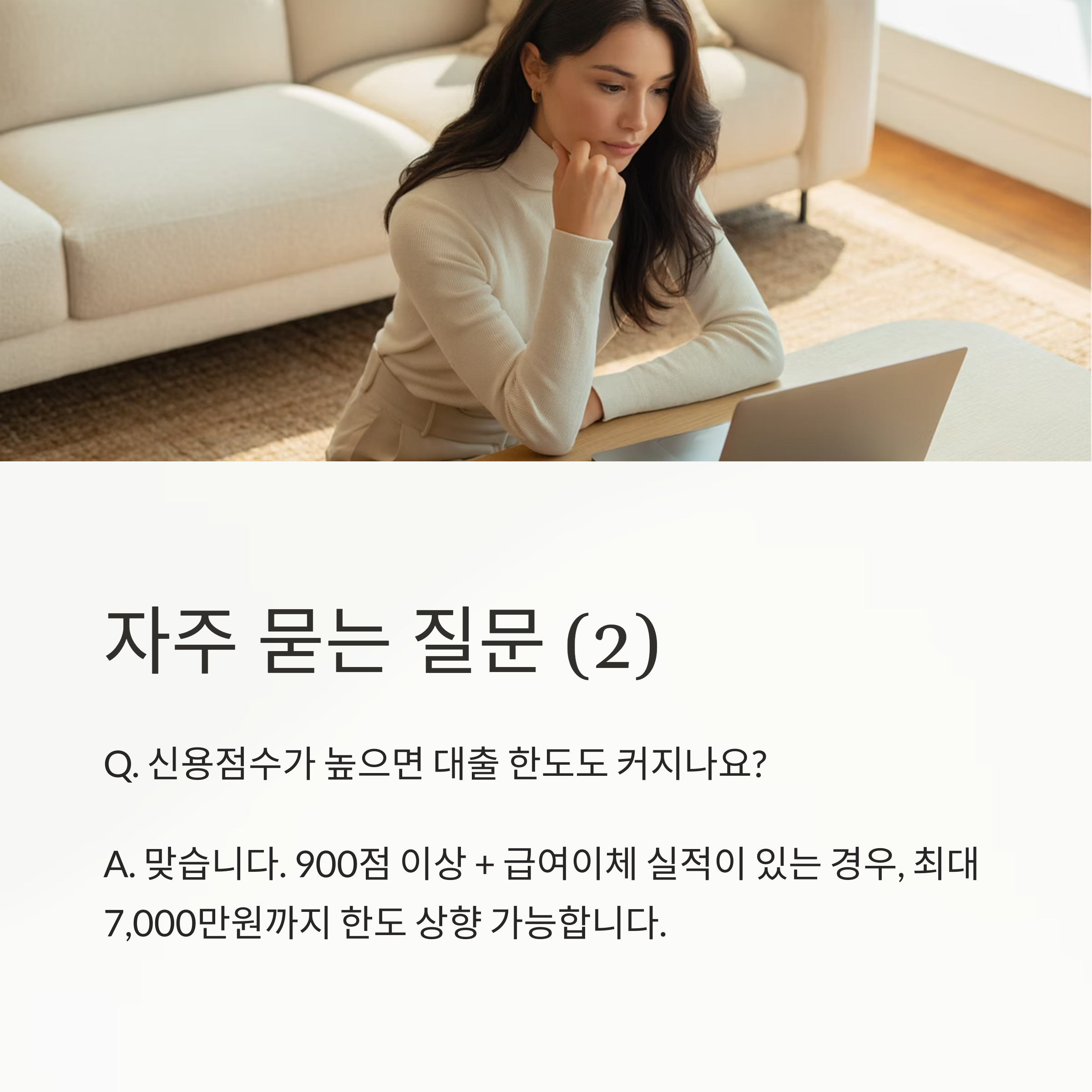 A2. 맞습니다. 900점 이상 + 급여이체 실적이 있는 경우, 최대 7,000만원까지 한도 상향 가능합니다.