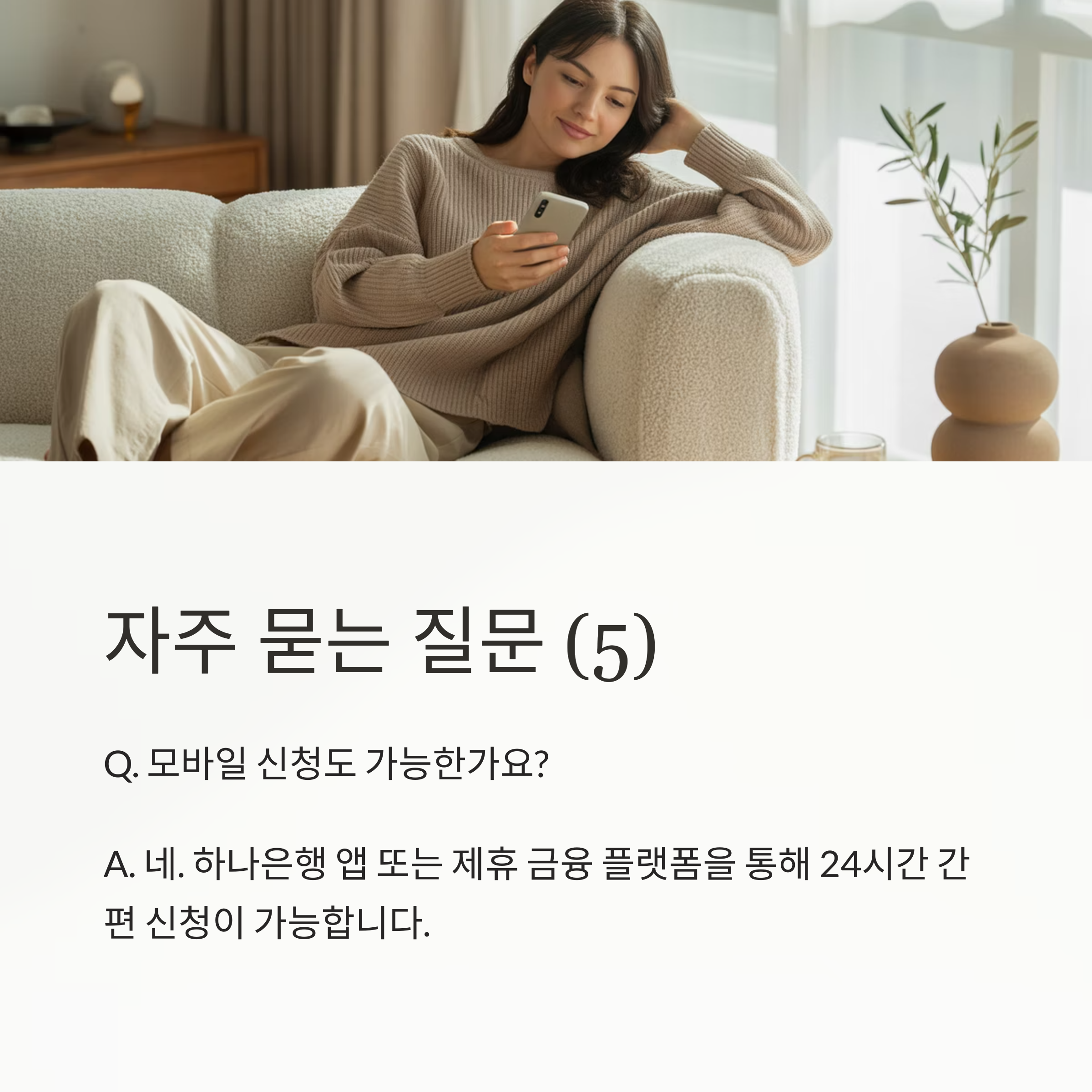 A5. 네. 하나은행 앱 또는 제휴 금융 플랫폼을 통해 24시간 간편 신청이 가능합니다.