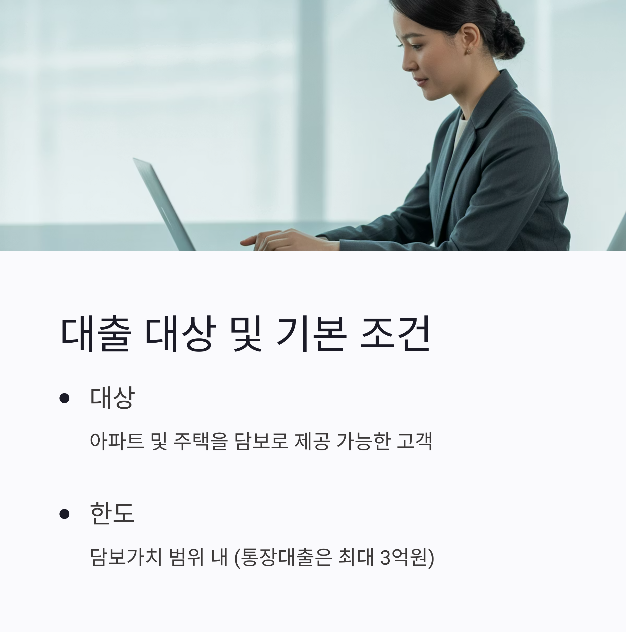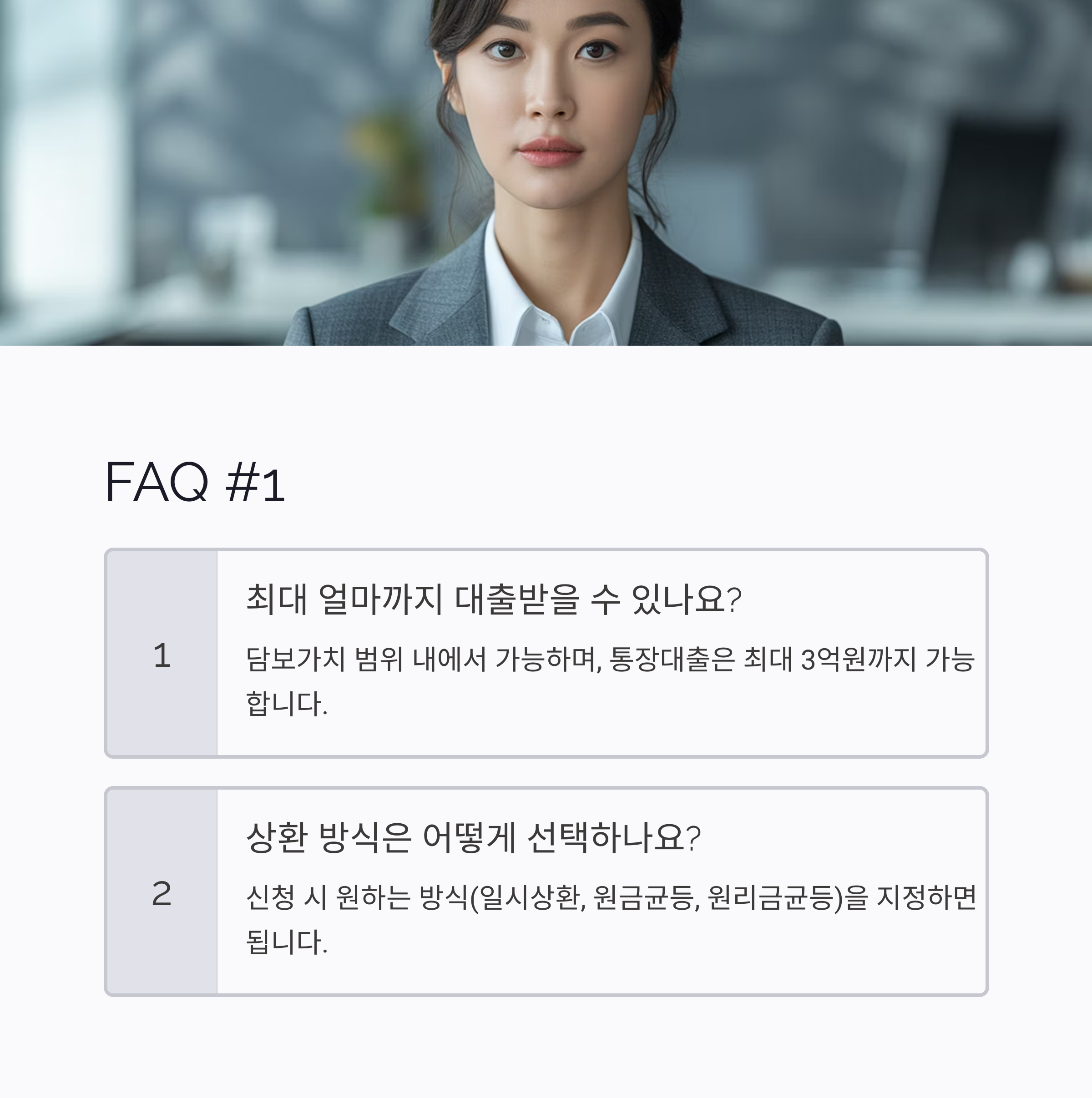 ✔ 한도: 담보가치 범위 내 (※ 통장대출은 최대 3억원)
