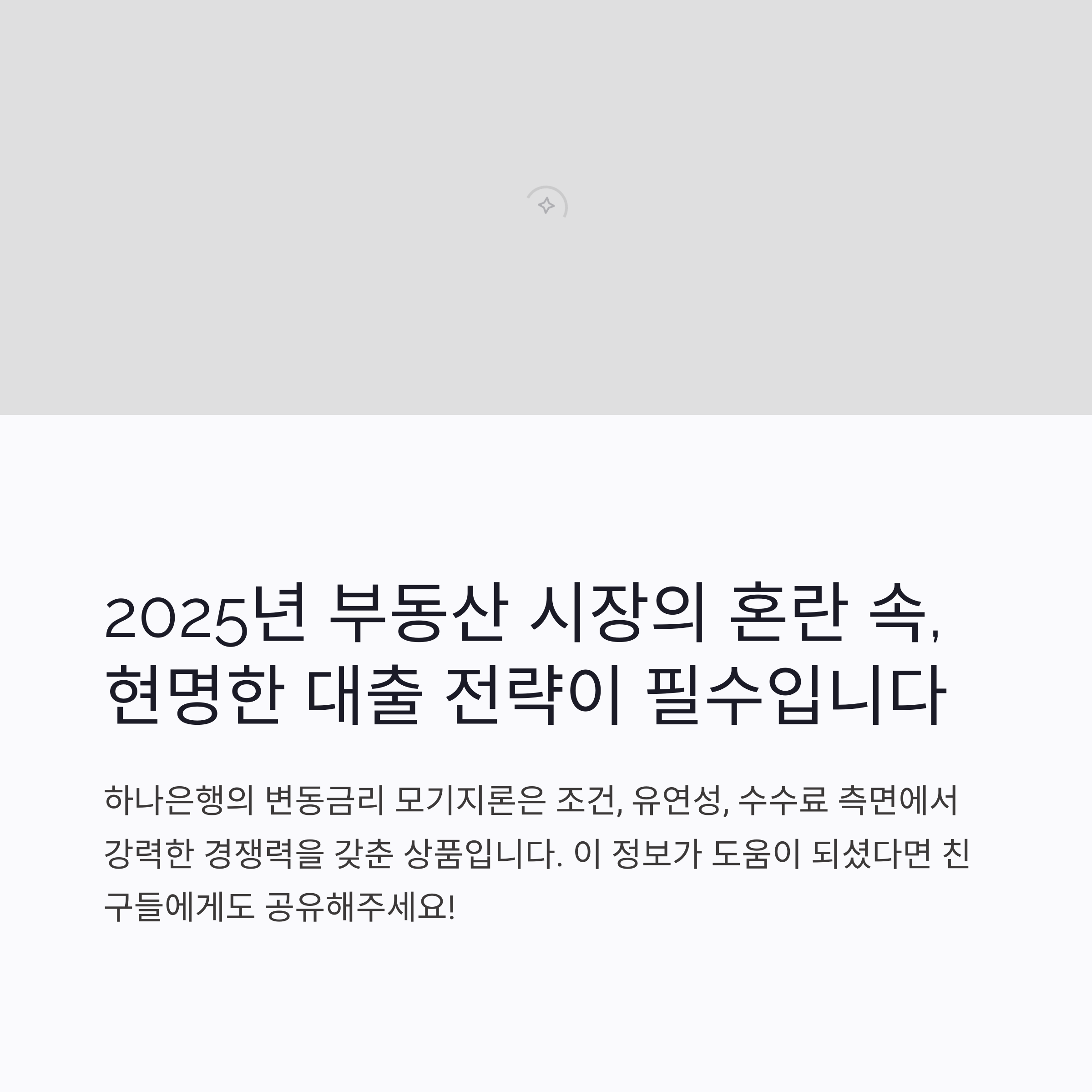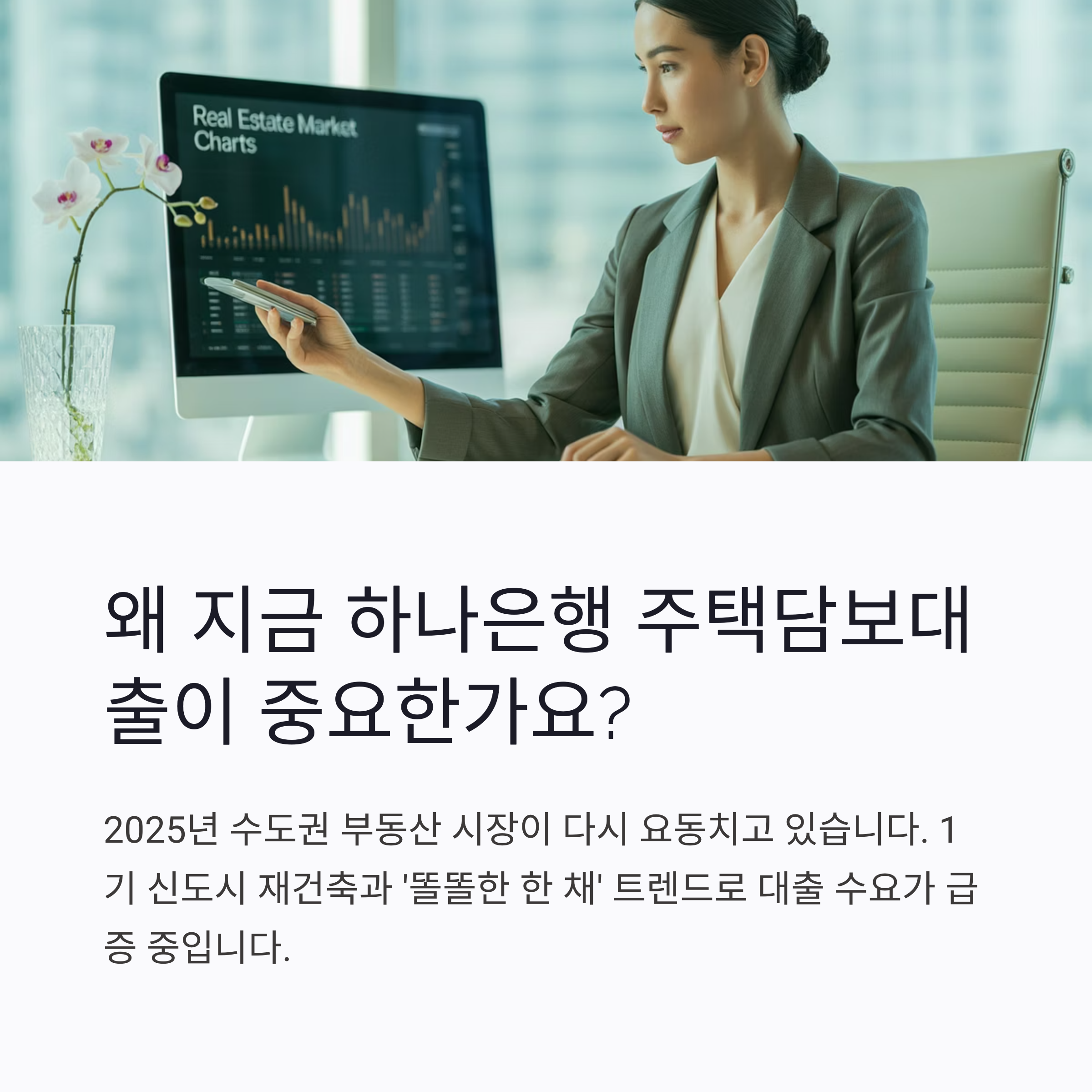 2025년 수도권 부동산 시장은 다시 요동치고 있습니다. 1기 신도시 재건축과 공급 불균형, 그리고 '똘똘한 한 채' 트렌드가 대출 수요를 급격히 끌어올리고 있죠.이 가운데 하나은행의 변동금리 모기지론은 실수요자부터 투자자까지 주목해야 할 상품입니다. 대출 한도, 금리, 조건, 중도상환수수료 등 핵심 정보를 총정리했습니다.