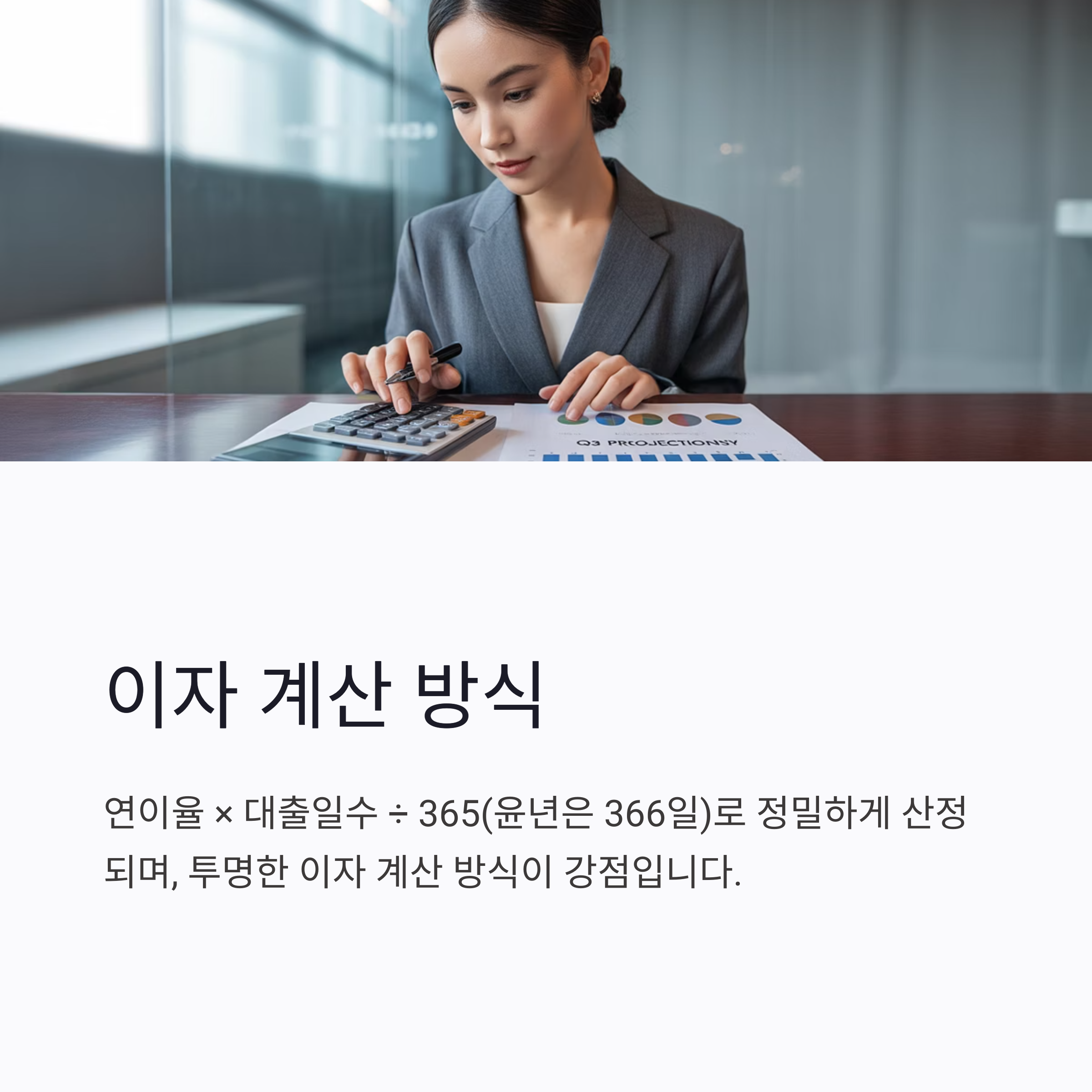 이자는 연이율 × 대출일수 ÷ 365(윤년은 366일)로 정밀하게 산정되며, 투명한 이자 계산 방식이
