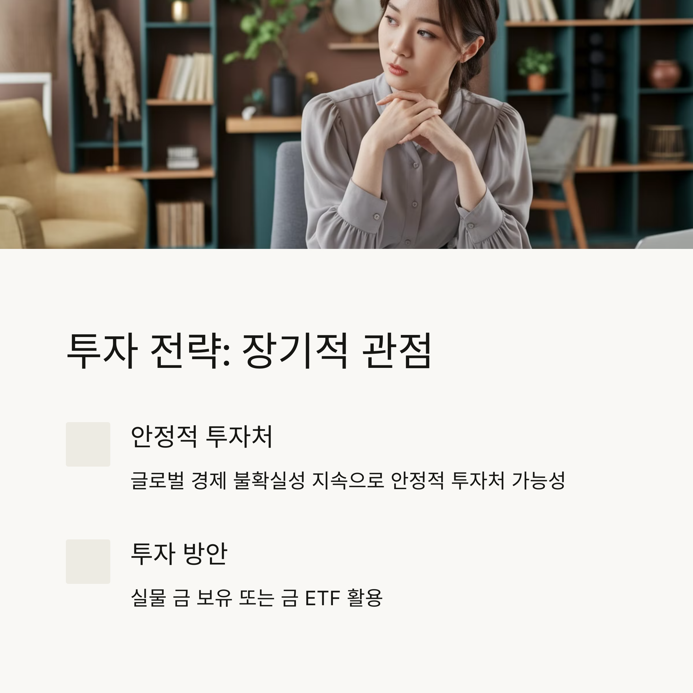 ✔ 실물 금을 보유하거나, 금 ETF와 같은 간접 투자 방안을 활용하는 것이 좋습니다.