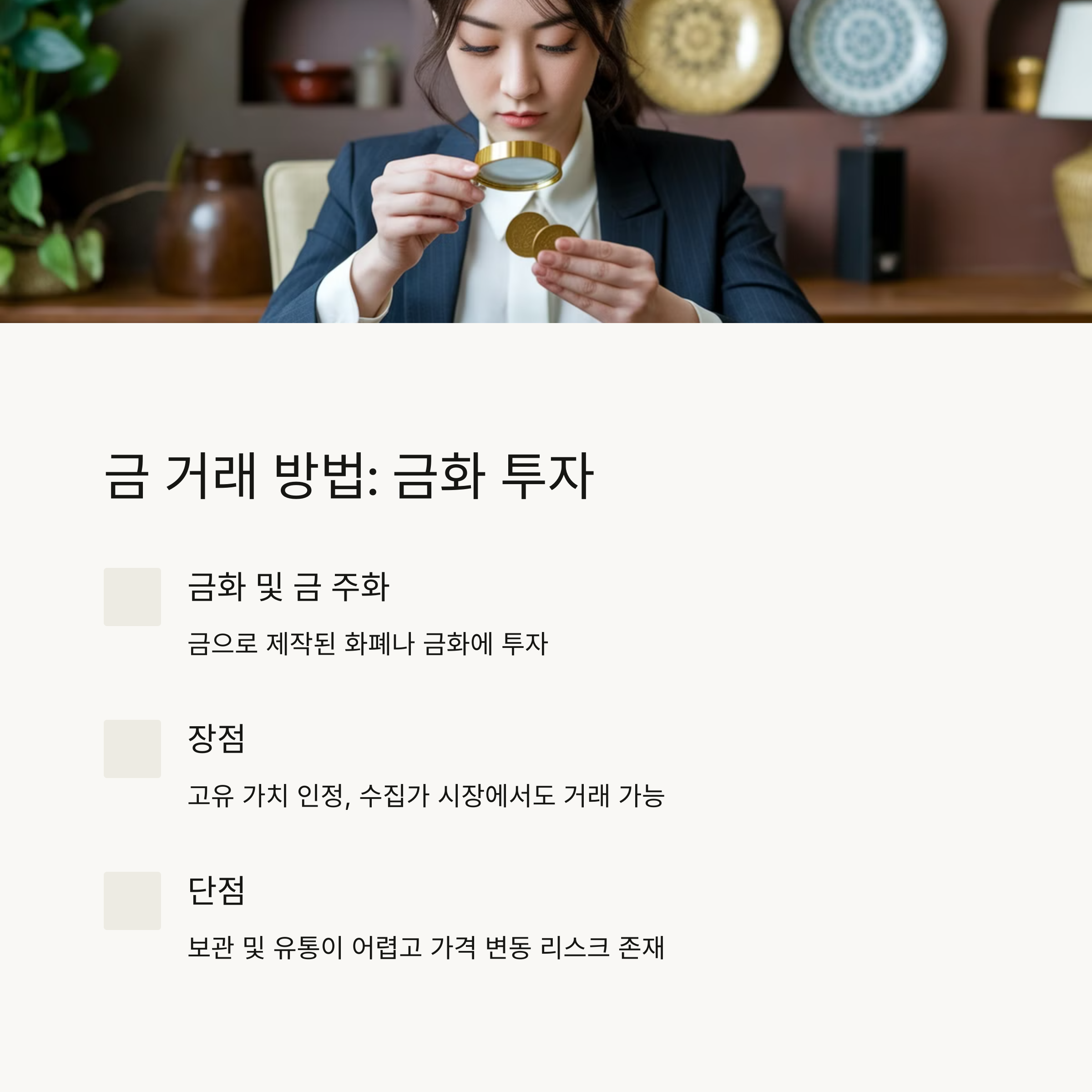 ✔ 금으로 제작된 화폐나 금화에 투자하는 방식입니다.