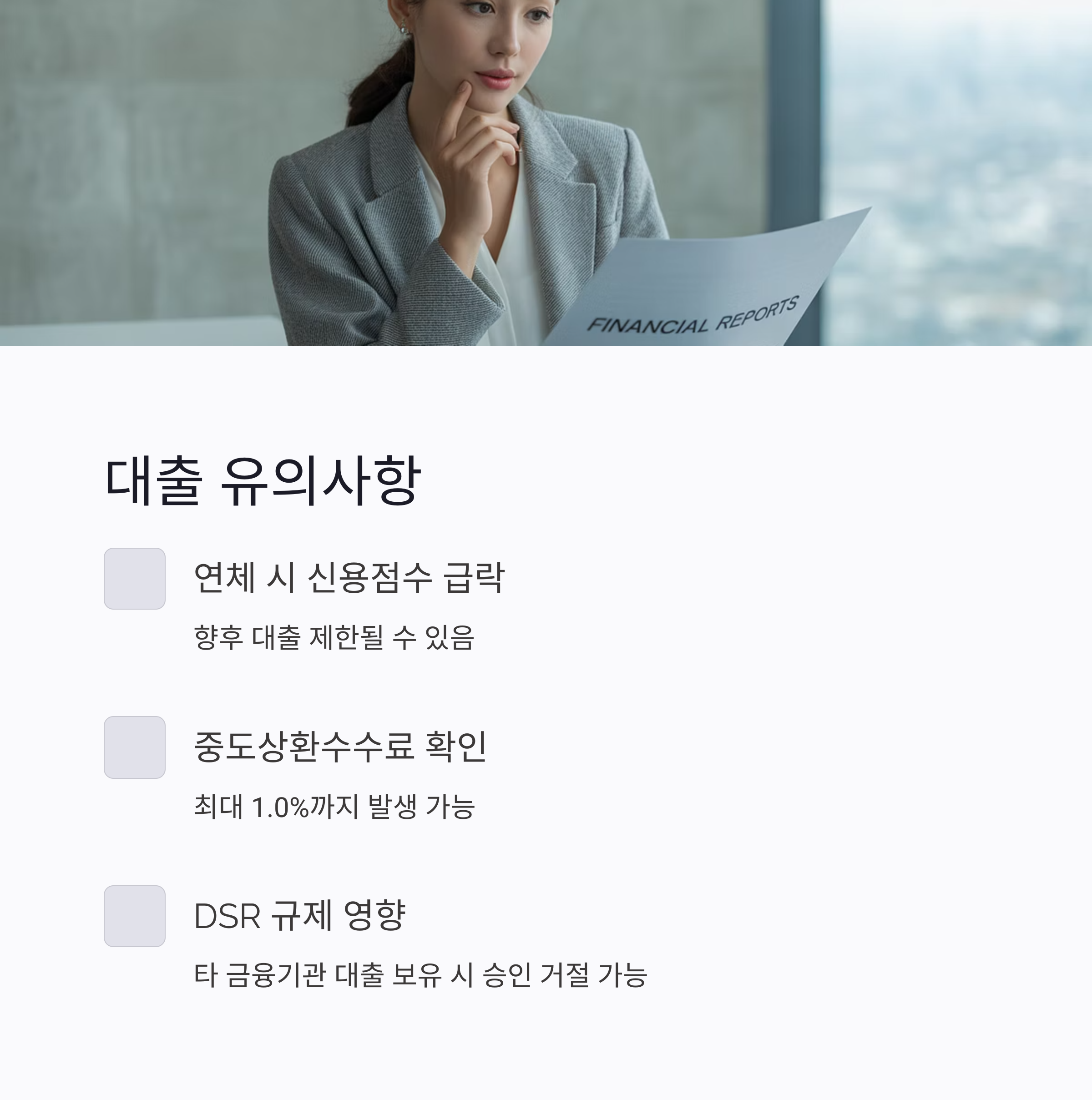 A3. 일부 상품에는 중도상환수수료(최대 1.0%)가 적용됩니다. 대출 계약서에서 반드시 확인하세요.