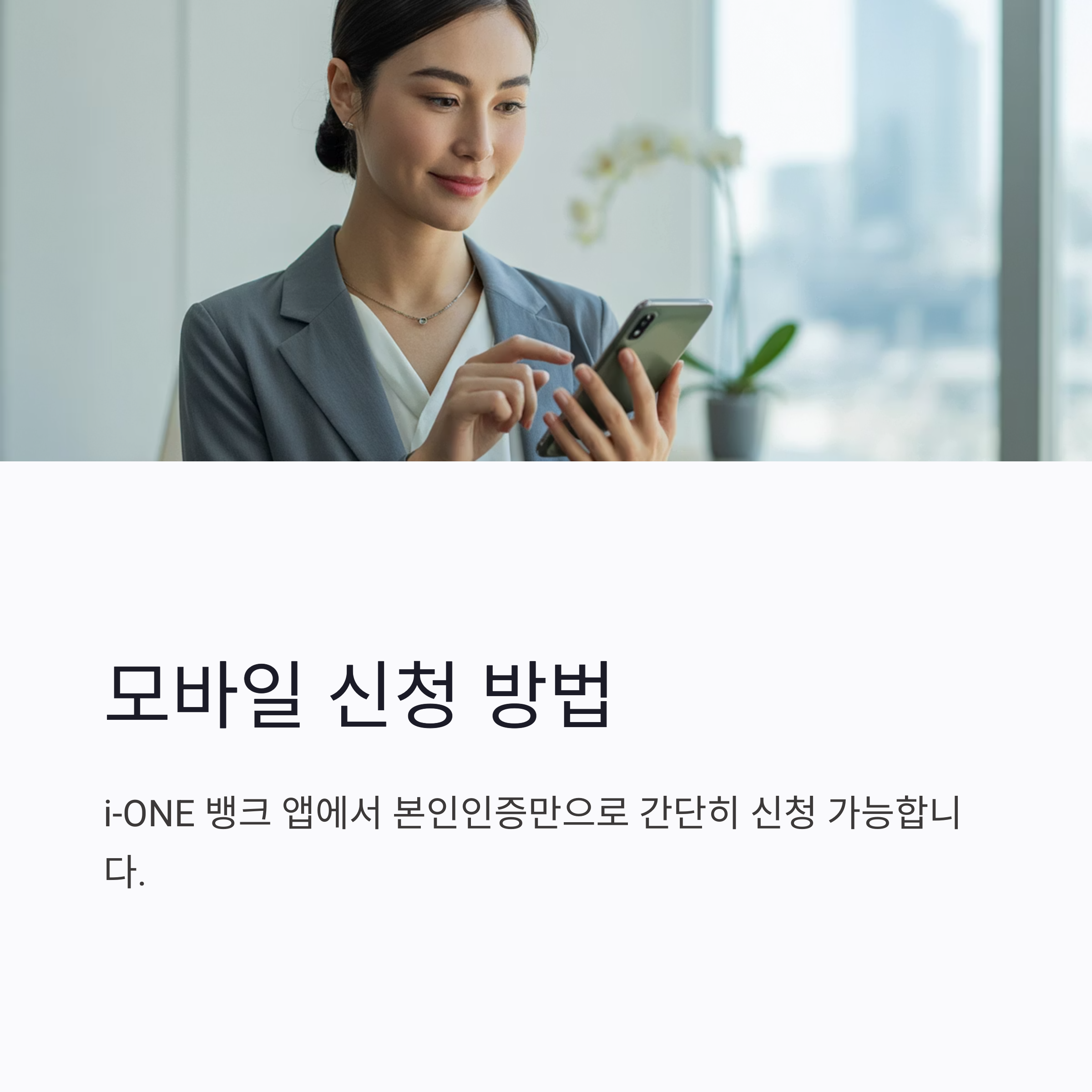 ✔ 신청 경로: 모바일(i-ONE 뱅크), 인터넷, 영업점 모두 가능