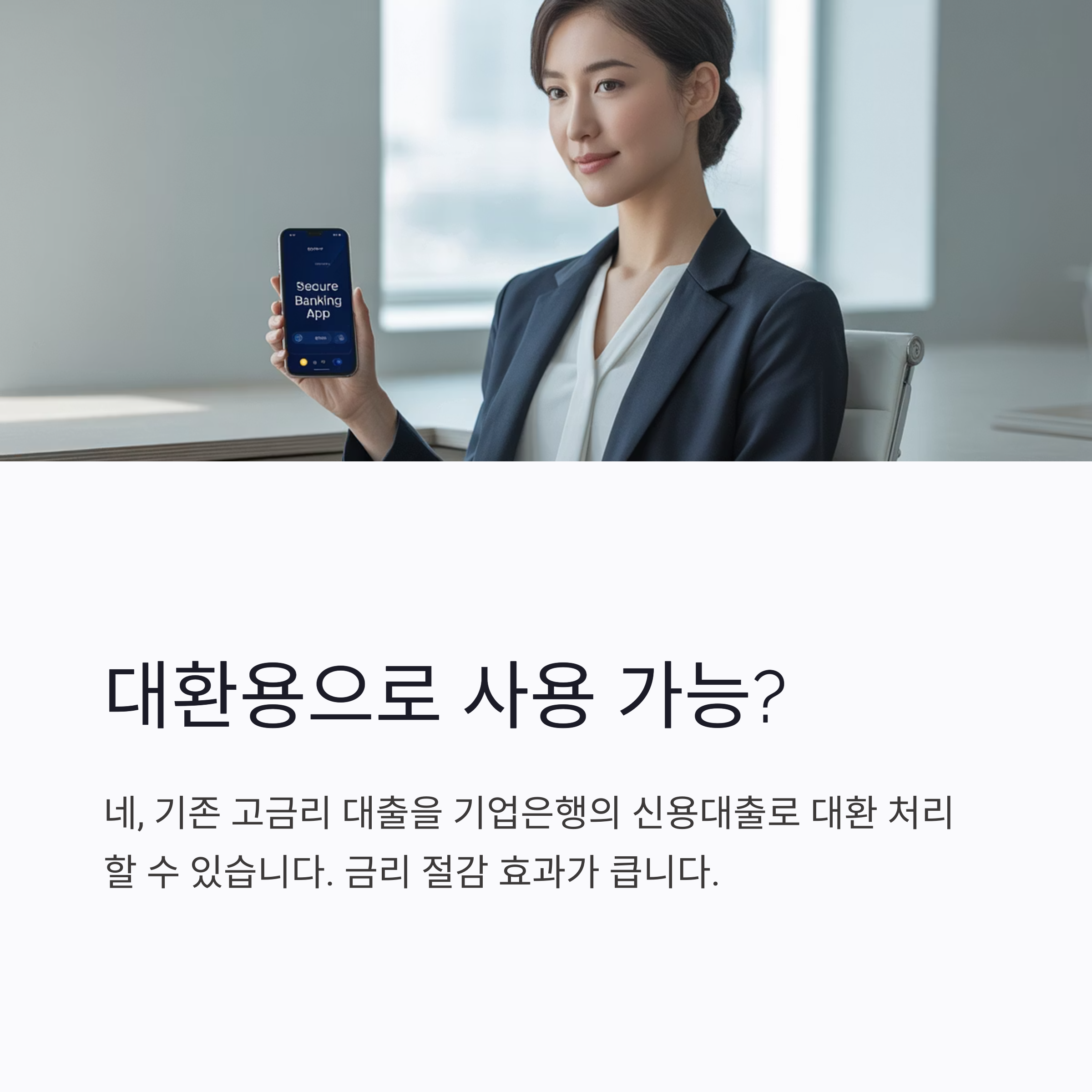 A5. 네, 기존 고금리 대출을 기업은행의 신용대출로 대환 처리할 수 있습니다. 금리 절감 효과 큽니다.
