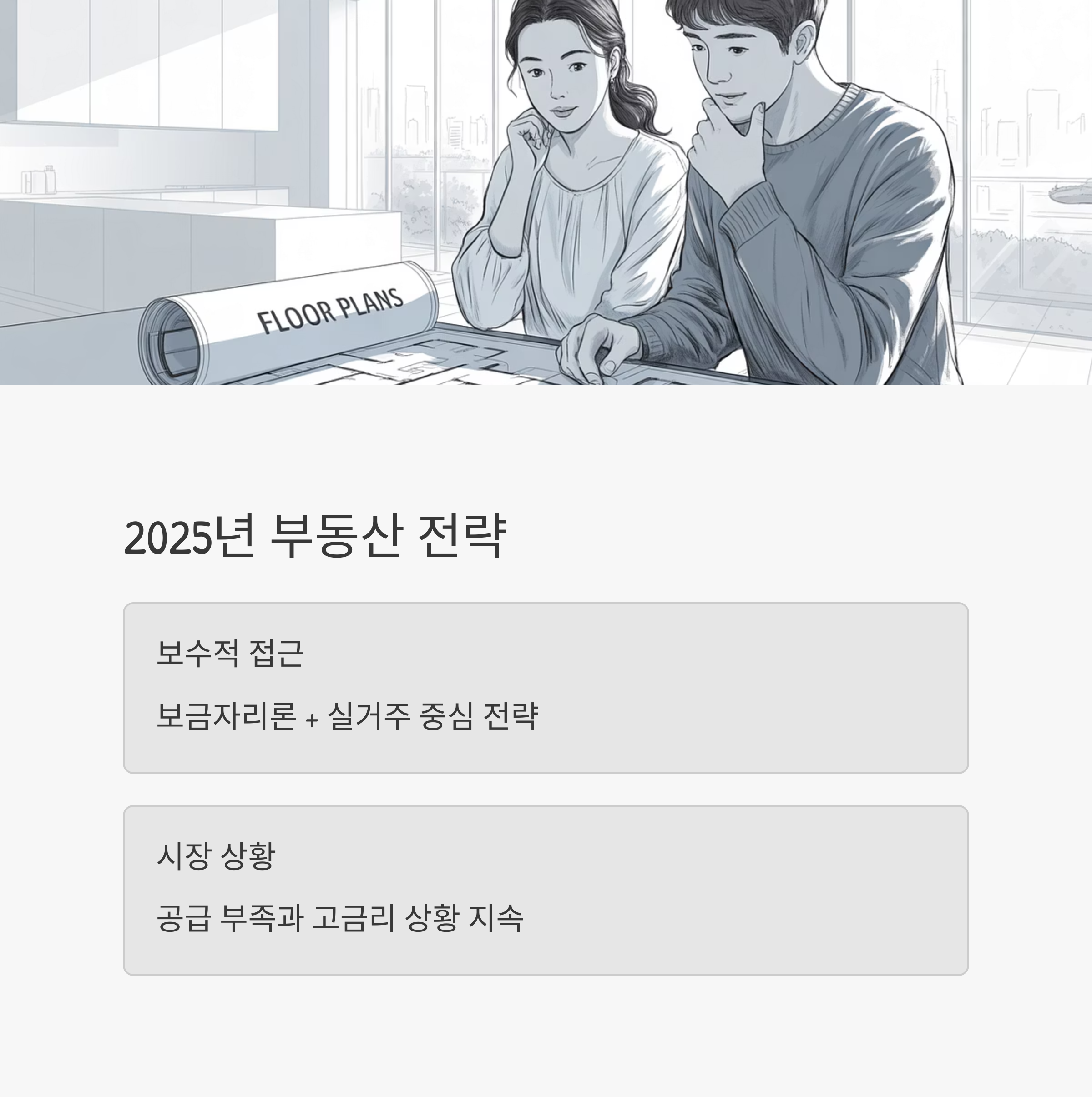2025년 부동산 시장은 불확실성과 기회의 교차점에 서 있습니다. 공급은 줄고 금리는 높은 가운데, 실수요자 중심의 주택 구매 전략이 무엇보다 중요해졌습니다.