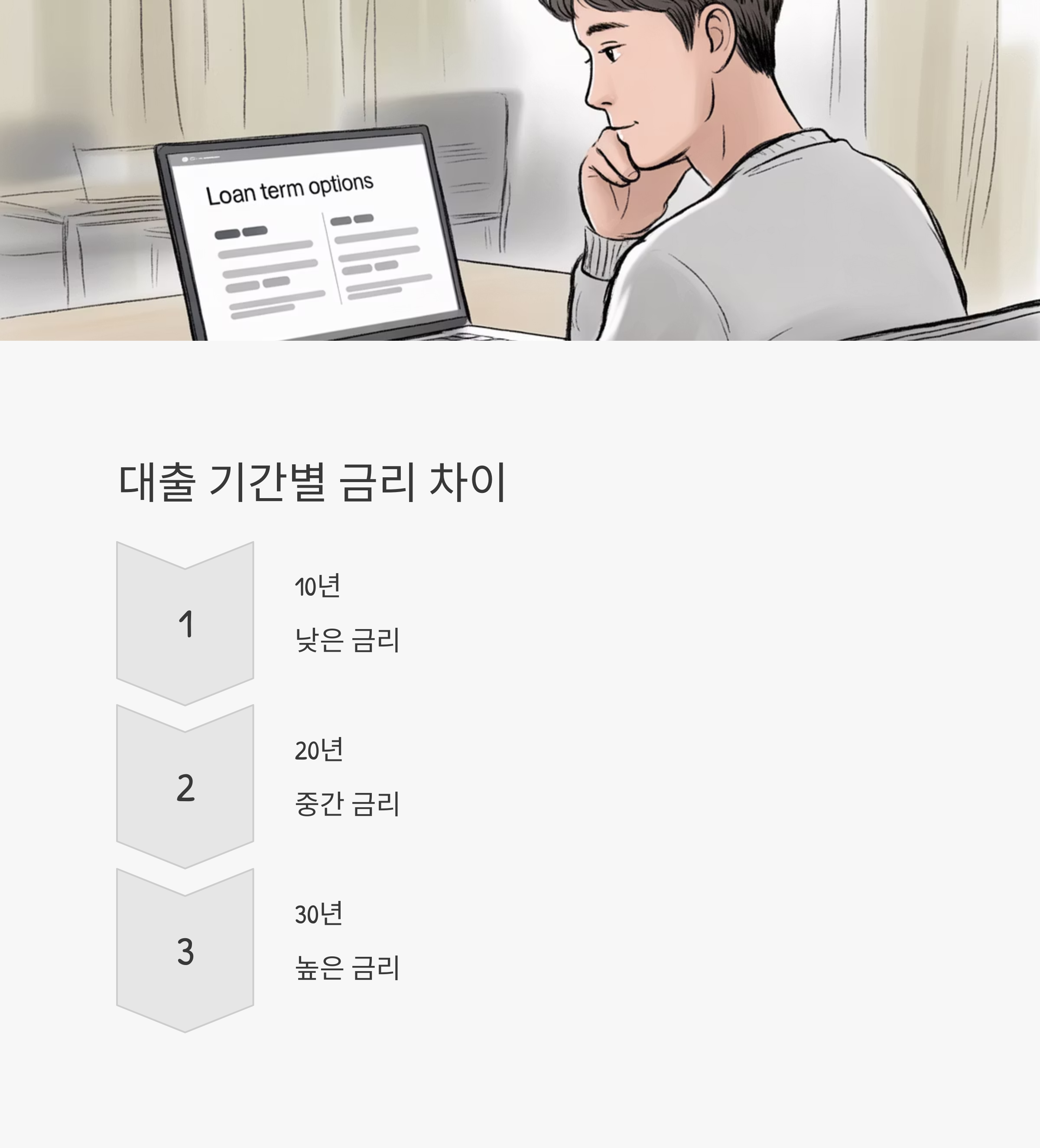 ✔ 대출기간: 10년/20년/30년 선택, 기간 길수록 금리 상승