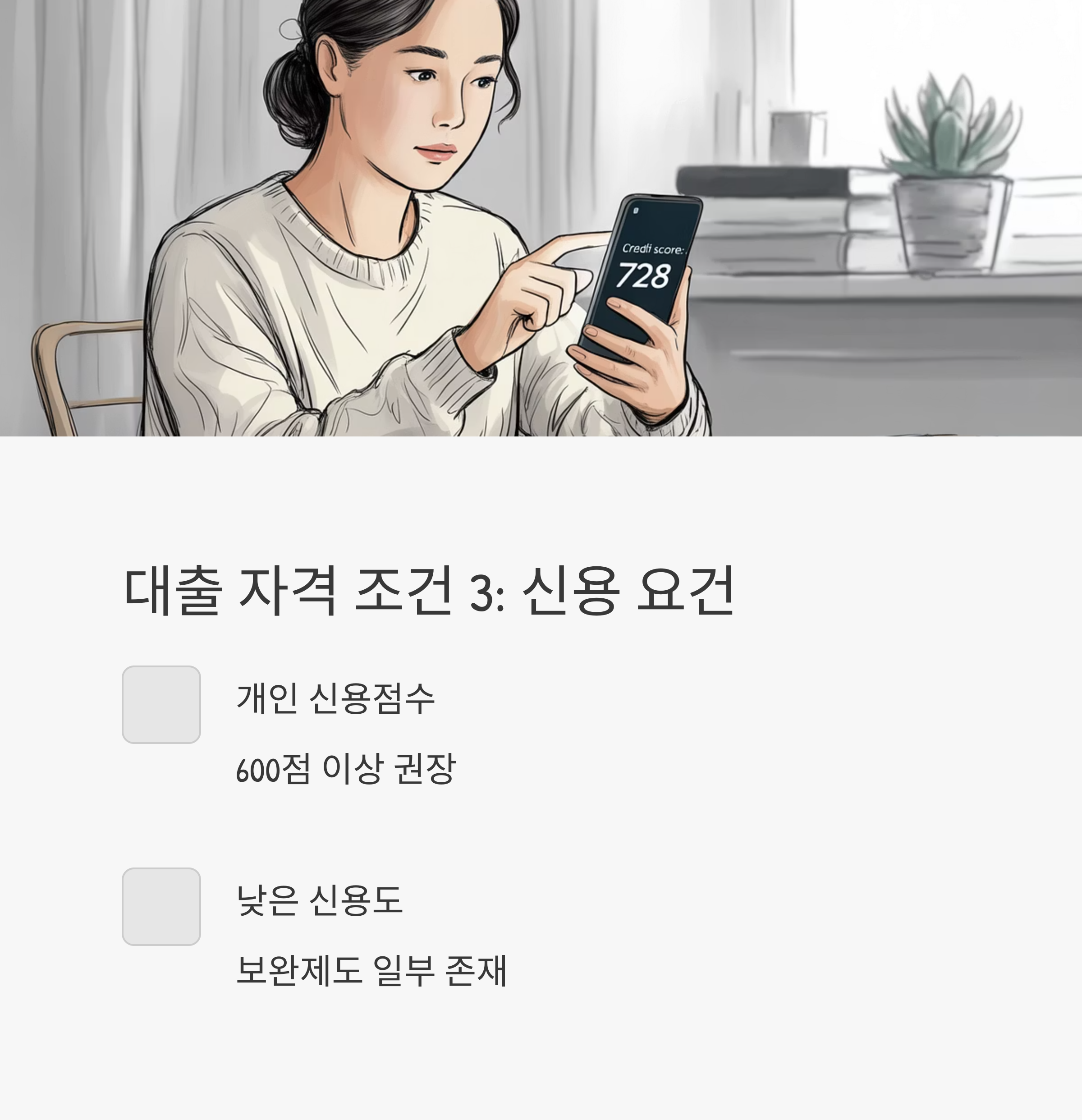 - 600점 이상 권장, 낮은 신용도 보완제도 일부 존재