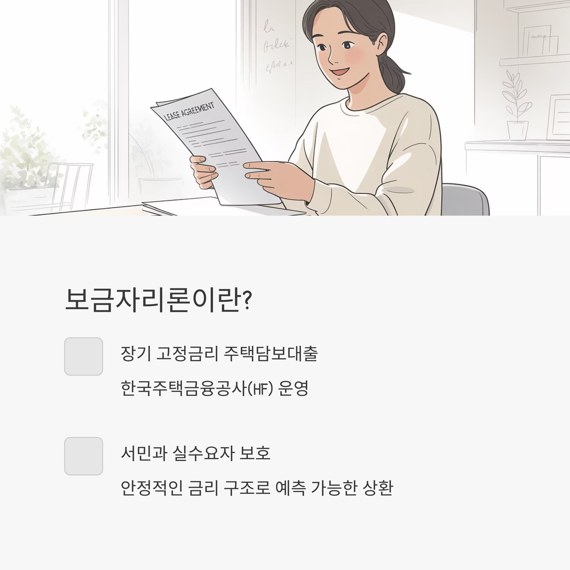 보금자리론은 한국주택금융공사(HF)에서 운영하는 장기 고정금리 주택담보대출 상품입니다. 주택 구매, 전세자금 마련 등 다양한 용도에 활용되며, 서민과 실수요자 보호를 위해 설계된 정책금융입니다.