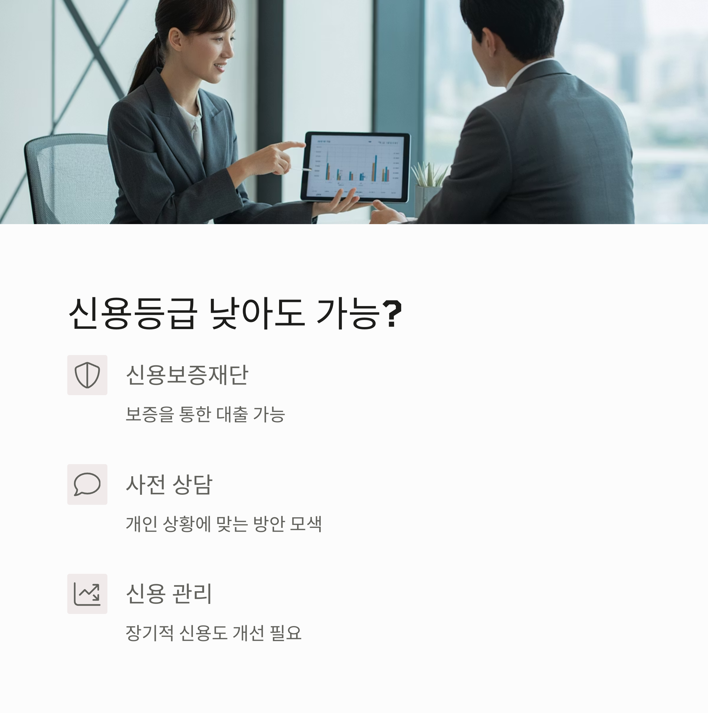 A3. 일부 자금은 신용보증재단 보증을 통해 신용등급이 낮아도 가능하므로 사전 상담이 필요합니다.