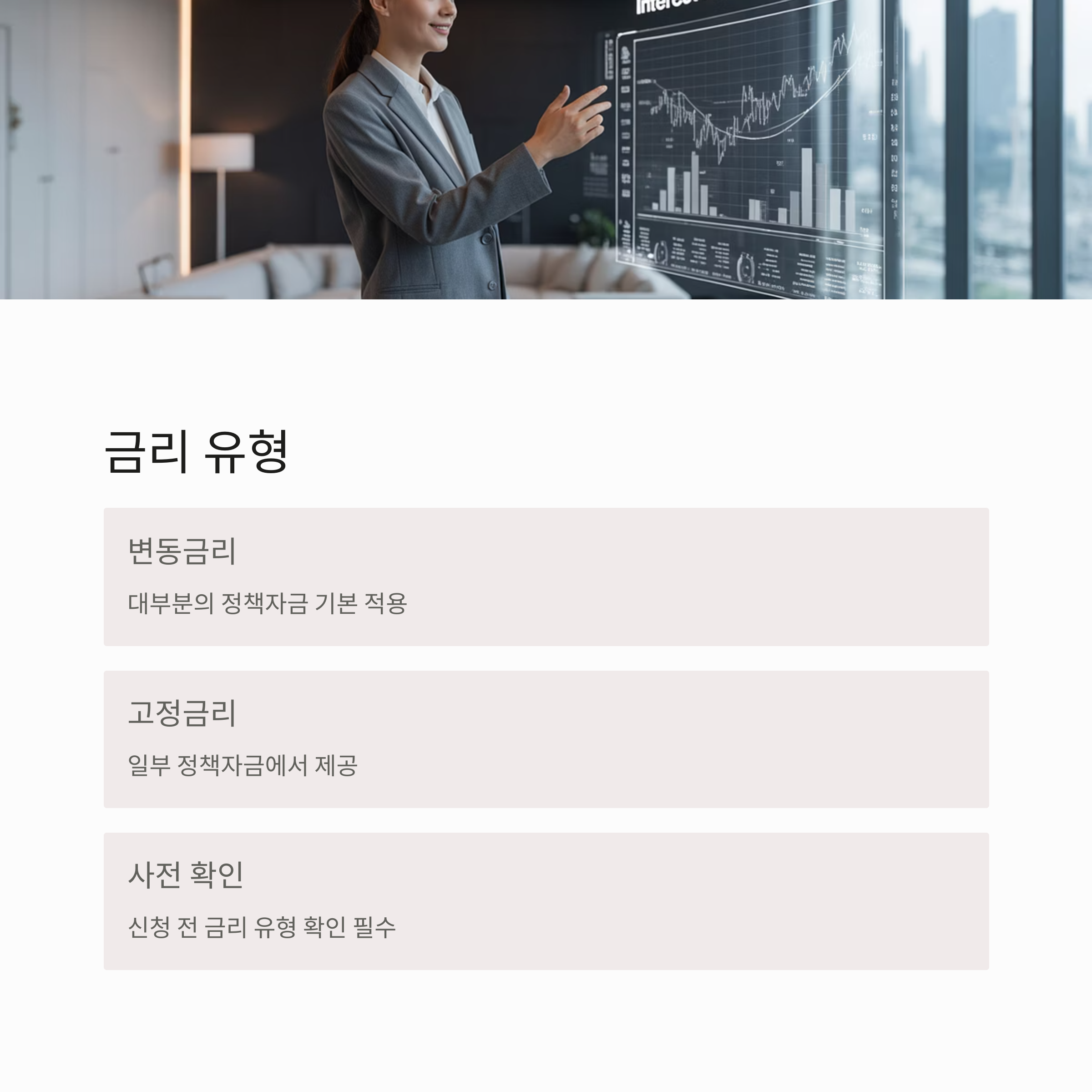 A4. 대부분 변동금리 기반이나, 일부 정책자금은 고정금리로 제공되기도 합니다. 사전 확인이 필수입니다.