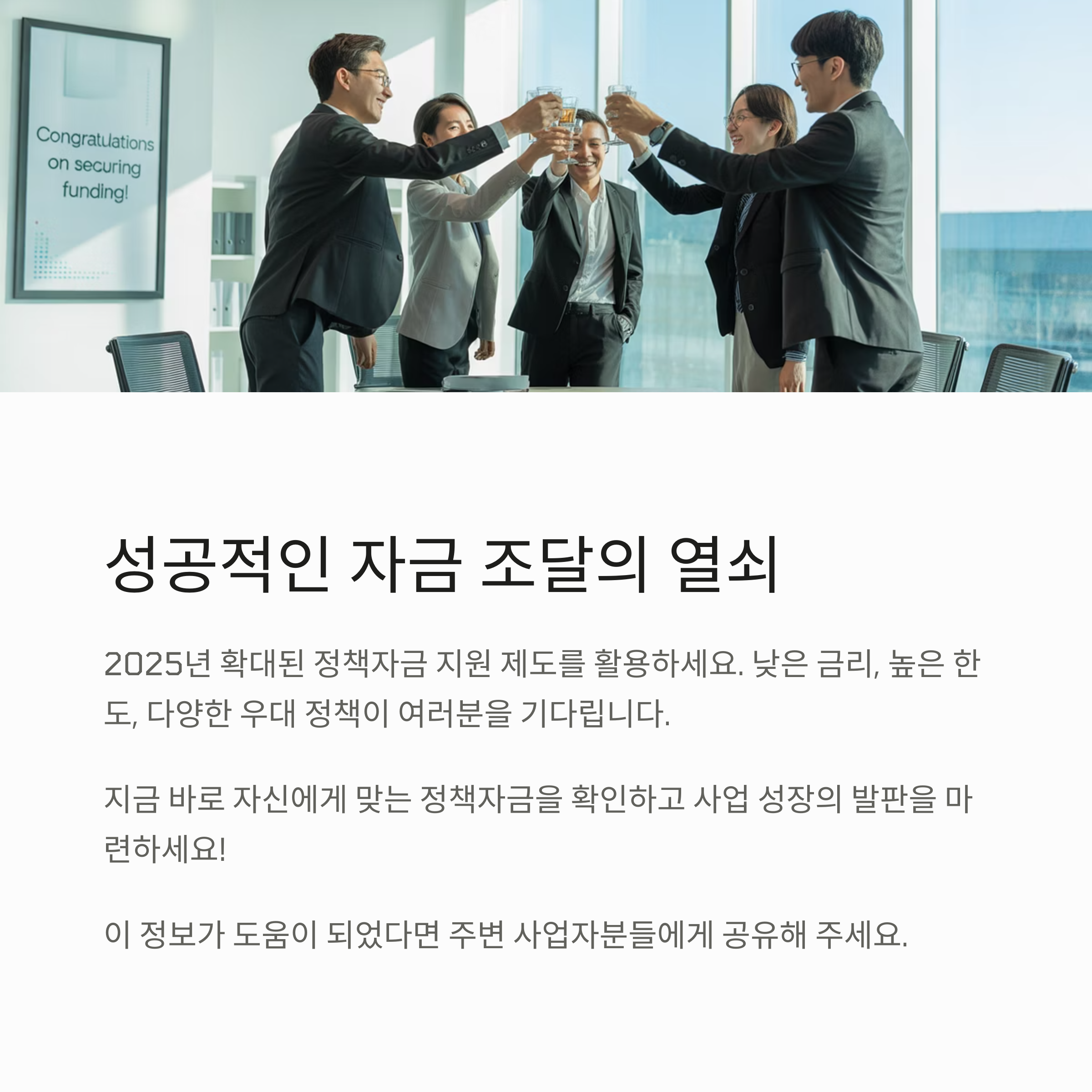 2025년을 맞이해 사업자 정책자금 지원 제도는 더욱 확대되고 있습니다. 낮은 금리와 높은 한도, 다양한 우대 정책은 소상공인과 중소기업에게 커다란 기회입니다. 단, 꼼꼼한 준비와 정확한 정보 확인이 성공의 열쇠입니다.