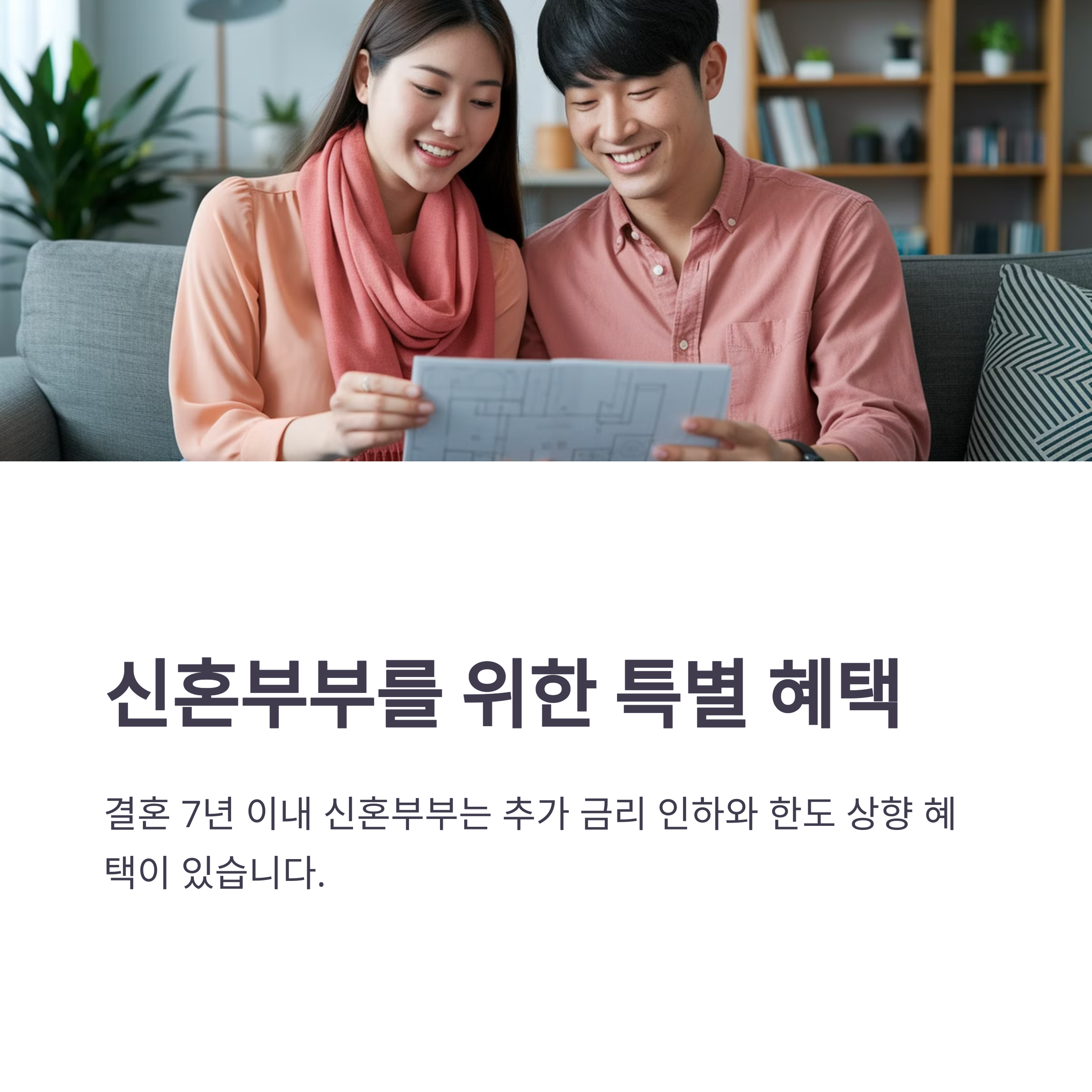 - 대출한도: 일반 2.5억원, 생애최초 최대 3억원, 신혼부부 최대 4억원