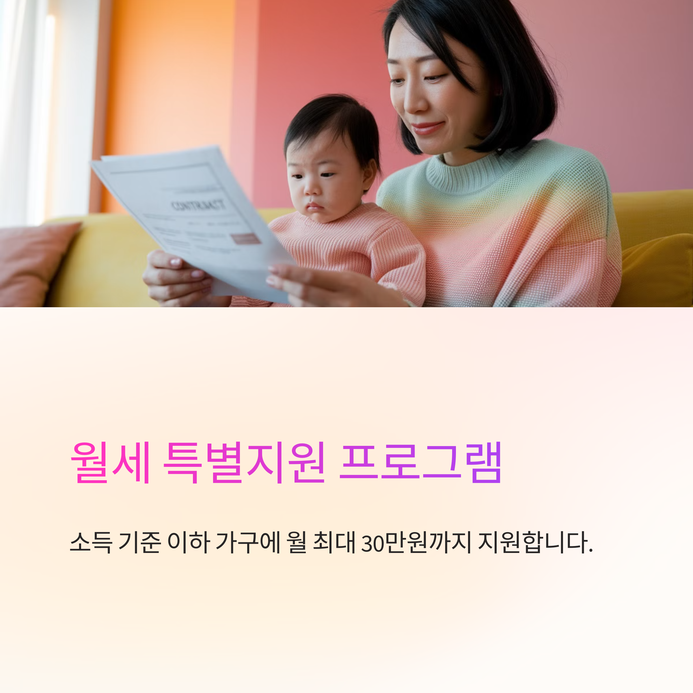 서울에 거주하며 무주택 상태인 출산 가구를 대상으로 월 30만 원, 최대 2년간 총 720만 원을 지원합니다.